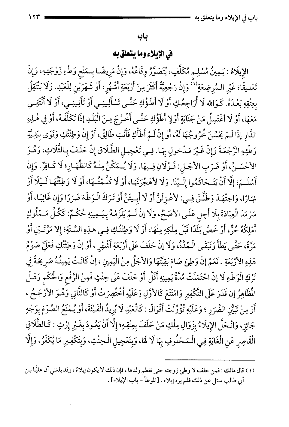 1- قال مالك: فمن حلف لا وطئ زوجته حتى تفطم ولدها فإن ذلك لا يكون إيلاء وقد بلغني أن عليا بن أبي طالب سئل عن ذلك فلم يره إيلاء. [الموطأ – باب الإيلاء] .