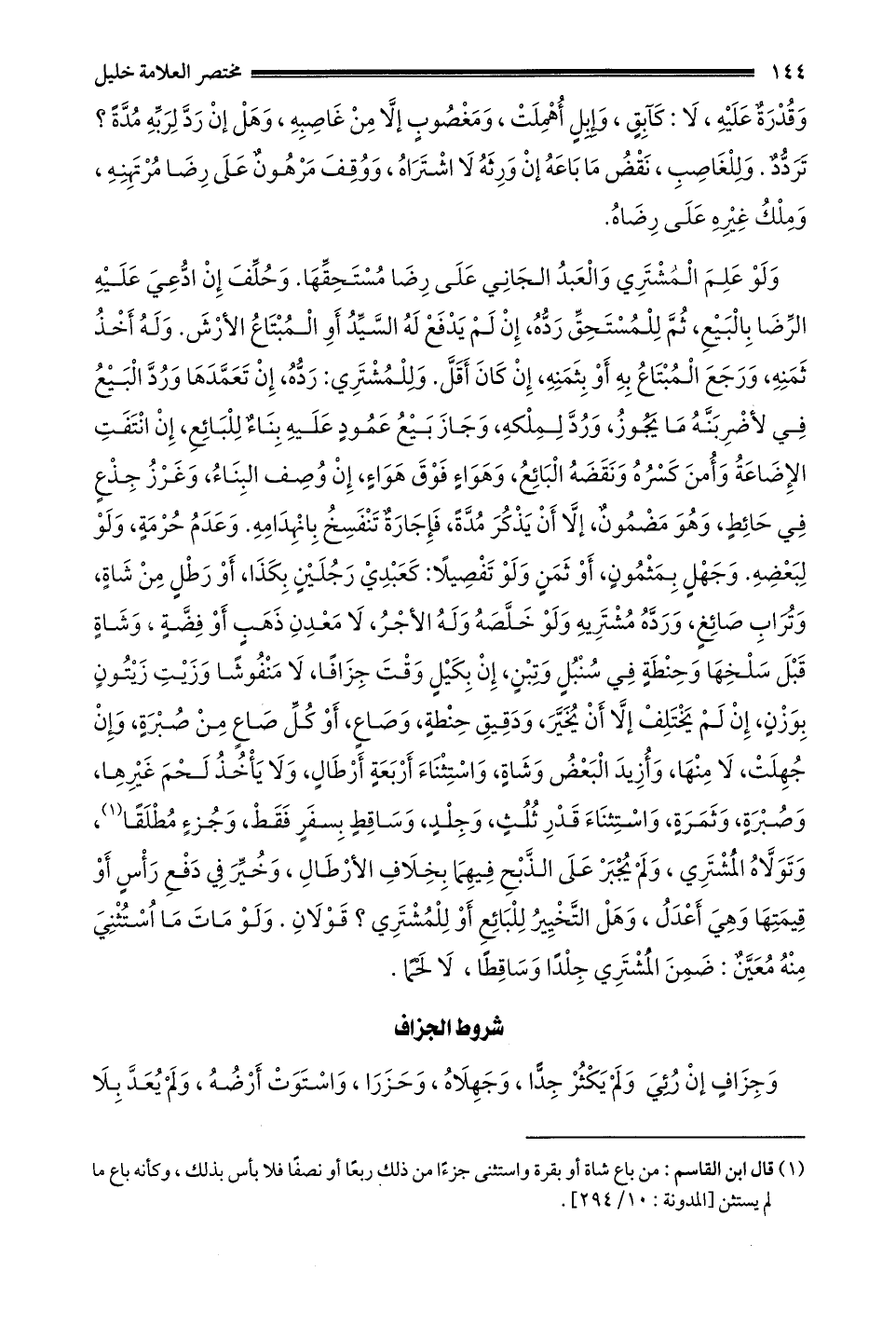 وَلَوْ عَلِمَ الْمُشْتَرِي والعبد الجاني على رضا مُسْتَحِقِّهَا وَحَلَفَ إنْ ادَّعَى عَلَيْهِ الرِّضَا بِالْبَيْعِ ثُمَّ لِلْمُسْتَحِقِّ رَدُّهُ إنْ لَمْ يَدْفَعْ لَهُ السَّيِّدُ أَوْ الْمُبْتَاعُ الْأَرْشَ وَلَهُ أَخْذُ ثَمَنِهِ وَرَجَعَ الْمُبْتَاعُ بِهِ أَوْ بِثَمَنِهِ إنْ كَانَ أقل وللمشتري: رده إن تعمدها ورد البيع في لأضربته ما يجوز ورد لملكه وجاز بيع عمود عليه بناء للبائع إن انتفت الإضاعة وأمن كسره ونقضه البائع وهواء فوق هواء إن وصف البناء وَغَرْزُ جِذْعٍ فِي حَائِطٍ وَهُوَ مَضْمُونٌ إلَّا أن يذكر مدة فإجارة تنفسخ بانهدامه وعدم حرمة ولو لبعضه وجهل بمثمون أو ثمن ولو تفصيلا: كعبدي رجلين بكذا أو رطل من شاة وتراب صائغ ورده مشتريه ولو خلصه وله الأجر لا معدن ذهب أو فضة وشاة قبل سلخها وحنطة في سنبل وتبن إن بكيل وقت جزافا لا منفوشا وَزَيْتِ زَيْتُونٍ بِوَزْنٍ إنْ لَمْ يَخْتَلِفْ إلَّا أن يخير ودقيق حنطة وَصَاعٍ أَوْ كُلَّ صَاعٍ مِنْ صُبْرَةٍ وَإِنْ جهلت لا منها وأزيد البعض وشاة واستثناء أربعة أرطال ولا يأخذ لحم غيرها وصبرة وثمرة واستثناء قدر ثلث وجلد وساقط بسفر فقط وجزء مطلقا1 وتولاه المشتري وَلَمْ يُجْبَرْ عَلَى الذَّبْحِ فِيهِمَا بِخِلَافِ الْأَرْطَالِ وَخُيِّرَ فِي دَفْعِ رَأْسٍ أَوْ قِيمَتِهَا وَهِيَ أعدل وهل التخيير للبائع أو للمشتري؟ قولان وَلَوْ مَاتَ مَا اُسْتُثْنِيَ مِنْهُ مُعَيَّنٌ: ضَمِنَ المشتري جلدا وساقطا لا لحما.