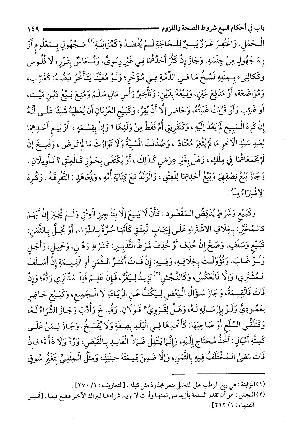 الحمل واغتفر غرر يسير للحاجة لم يقصد وكمزابنة1 مجهول بمعلوم أو بمجهول من جنسه وَجَازَ إنْ كَثُرَ أَحَدُهُمَا فِي غَيْرِ رِبَوِيٍّ ونخاس بتور لا فلوس وككآلىء بمثله فَسْخُ مَا فِي الذِّمَّةِ فِي مُؤَخَّرٍ وَلَوْ معينا يتأخر قبضه: كغائب ومواضعة أو منافع عين وبيعه بدين: وتأخير رأس مال سلم ومنع بيع دين ميت أو غائب وَلَوْ قَرُبْت غَيْبَتُهُ وَحَاضِرٍ إلَّا أَنْ يُقِرَّ وَكَبَيْعِ الْعُرْبَانِ أَنْ يُعْطِيَهُ شَيْئًا عَلَى أَنَّهُ أن كره المبيع لم يعد إليه وَكَتَفْرِيقِ أُمٍّ فَقَطْ مِنْ وَلَدِهَا وَإِنْ بِقِسْمَةٍ أو بيع أحدهما لعبد سيد الآخر ما لم يثغر معتادا وصدقت المسبية ولا توارث ما لم ترض وفسخ إن لم يجمعاهما في ملك وهل بغير عوض كذلك أو يكتفي بحوز كالعتق؟ تأويلان وجاز بيع نصفهما وبيع أحدهما للعتق والولد مع كتابة أمه ولمعاهد: التفرقة وكره الاشتراء منه.