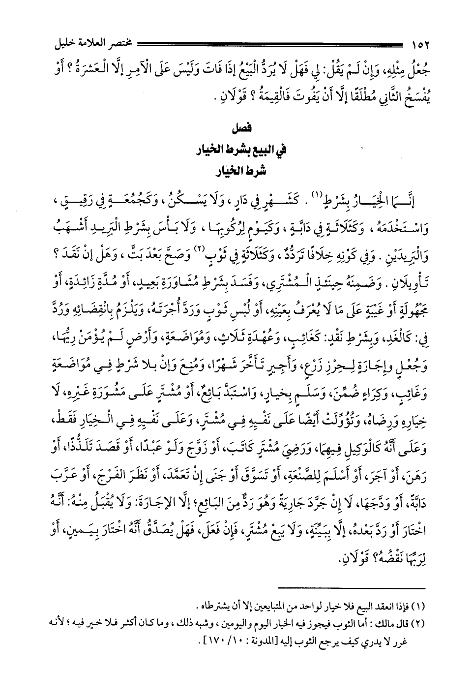 إنما الخيار بشرط1 كشهر في دار ولا يسكن وكجمعة في رقيق واستخدمه وَكَثَلَاثَةٍ فِي دَابَّةٍ وَكَيَوْمٍ لِرُكُوبِهَا وَلَا بَأْسَ بِشَرْطِ الْبَرِيدِ أَشْهَبُ وَالْبَرِيدَيْنِ وَفِي كَوْنِهِ خِلَافًا تردد وكثلاثة في ثوب2 وَصَحَّ بَعْدَ بَتٍّ وَهَلْ إنْ نَقَدَ؟ تَأْوِيلَانِ وضمنه حينئذ المشتري وَفَسَدَ بِشَرْطِ مُشَاوِرَةِ بَعِيدٍ أَوْ مُدَّةٍ زَائِدَةٍ أو مجهولة أَوْ غَيْبَةٍ عَلَى مَا لَا يُعْرَفُ بِعَيْنِهِ أو لبس ثوب ورد أجرته ويلزم بانقضائه ورد في: كالغد وبشرط نقد: كغائب وعهدة ثلاث ومواضعة وأرض لم يؤمن ريها وجعل وإجارة لحرز زرع وأجير تأخر شهرا وَمُنِعَ وَإِنْ بِلَا شَرْطٍ فِي مُوَاضَعَةٍ وَغَائِبٍ وكراء ضمن وسلم بخيار وَاسْتَبَدَّ بَائِعٌ أَوْ مُشْتَرٍ عَلَى مَشُورَةِ غَيْرِهِ لا خياره ورضاه وتؤولت أيضا على نفيه في مشتر وعلى نفيه في الخيار فقط وعلى أنه كالوكيل فيهما ورضي مشتر كاتب أو زوج ولو عبدا أو قصد تلذذا أَوْ رَهَنَ أَوْ آجَرَ أَوْ أَسْلَمَ لِلصَّنْعَةِ أو تسوق أو جنى إن تعمد أو نظر الفرج أو عرب دابة أو ودجها لا إن جرد جارية وهو رد من البائع إلا الإجارة: وَلَا يُقْبَلُ مِنْهُ: أَنَّهُ اخْتَارَ أَوْ رَدَّ بعده إلا ببينة ولا يبع مشتر فَإِنْ فَعَلَ فَهَلْ يَصْدُقُ أَنَّهُ اخْتَارَ بِيَمِينٍ أو لربها نقضه؟ قولان.