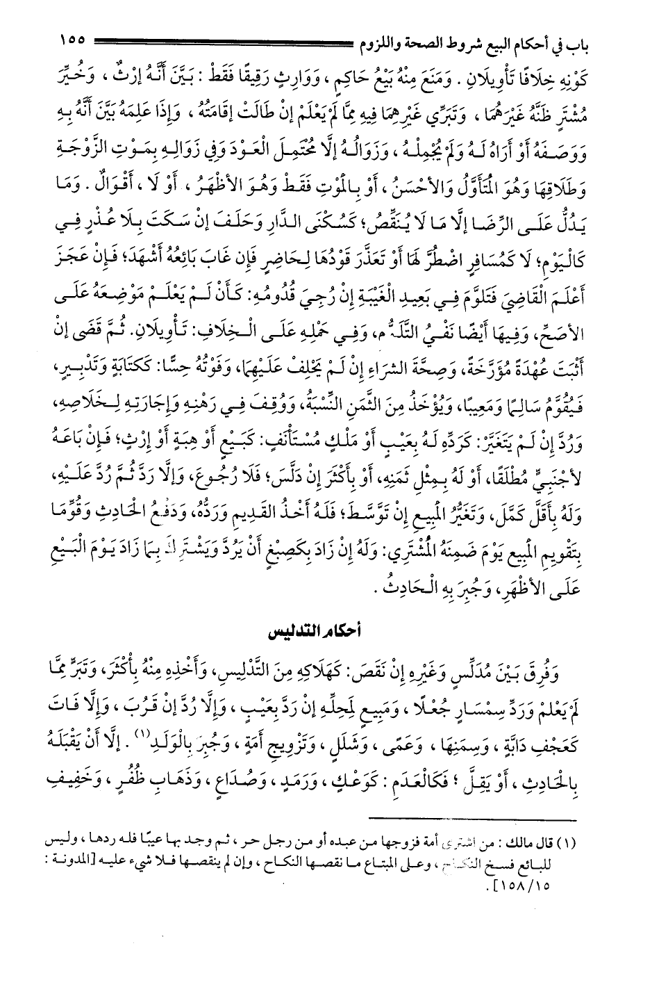 كونه خلافا تأويلان وَمَنَعَ مِنْهُ بَيْعُ حَاكِمٍ وَوَارِثٍ رَقِيقًا فَقَطْ: بين أنه إرث وخير مشتر ظنه غيرهما وَتَبَرِّي غَيْرِهِمَا فِيهِ مِمَّا لَمْ يُعْلَمْ إنْ طالت إقامته وَإِذَا عَلِمَهُ بَيَّنَ أَنَّهُ بِهِ وَوَصَفَهُ أَوْ أراه له ولم يجمله وزواله إلا محتمل العود وَفِي زَوَالِهِ بِمَوْتِ الزَّوْجَةِ وَطَلَاقِهَا وَهُوَ الْمُتَأَوَّلُ والأحسن أو بالموت فقط وهو الأظهر أو لا أقوال وَمَا يَدُلُّ عَلَى الرِّضَا إلَّا مَا لَا ينقص كسكنى الدار وَحَلَفَ إنْ سَكَتَ بِلَا عُذْرٍ فِي كَالْيَوْمِ لا كمسافر اضطر لها أو تعذر قودها لحاضر فَإِنْ غَابَ بَائِعُهُ أَشْهَدَ فَإِنْ عَجَزَ أَعْلَمَ الْقَاضِيَ فَتَلَوَّمَ فِي بَعِيدِ الْغَيْبَةِ إنْ رُجِيَ قُدُومُهُ: كَأَنْ لَمْ يَعْلَمْ مَوْضِعَهُ عَلَى الْأَصَحِّ وفيها أيضا نفي التلوم وفي حمله على الخلاف: تأويلان ثُمَّ قَضَى إنْ أَثْبَتَ عُهْدَةً مُؤَرَّخَةً وَصِحَّةَ الشراء إن لم يحلف عليهما وفوته حسا: ككتابة وتدبير فَيُقَوَّمُ سَالِمًا وَمَعِيبًا وَيُؤْخَذُ مِنْ الثَّمَنِ النِّسْبَةُ ووقف في رهنه وإجارته لخلاصه ورد إن لم يتغير: كعوده له بعيب أو ملك مستأنف: كبيع أو هبة أو إرث فَإِنْ بَاعَهُ لِأَجْنَبِيٍّ مُطْلَقًا أَوْ لَهُ بِمِثْلِ ثَمَنِهِ أَوْ بِأَكْثَرَ إنْ دَلَّسَ فَلَا رُجُوعَ وَإِلَّا رُدَّ ثُمَّ رُدَّ عَلَيْهِ وَلَهُ بِأَقَلَّ كمل وَتَغَيُّرُ الْمَبِيعِ إنْ تَوَسَّطَ فَلَهُ أَخْذُ الْقَدِيمِ ورده ودفع الحادث وقوما بتقويم المبيع يوم ضمنه المشتري: وَلَهُ إنْ زَادَ بِكَصِبْغٍ أَنْ يَرُدَّ وَيَشْتَرِكَ بما زاد يوم البيع على الأظهر وجبر به الحادث.