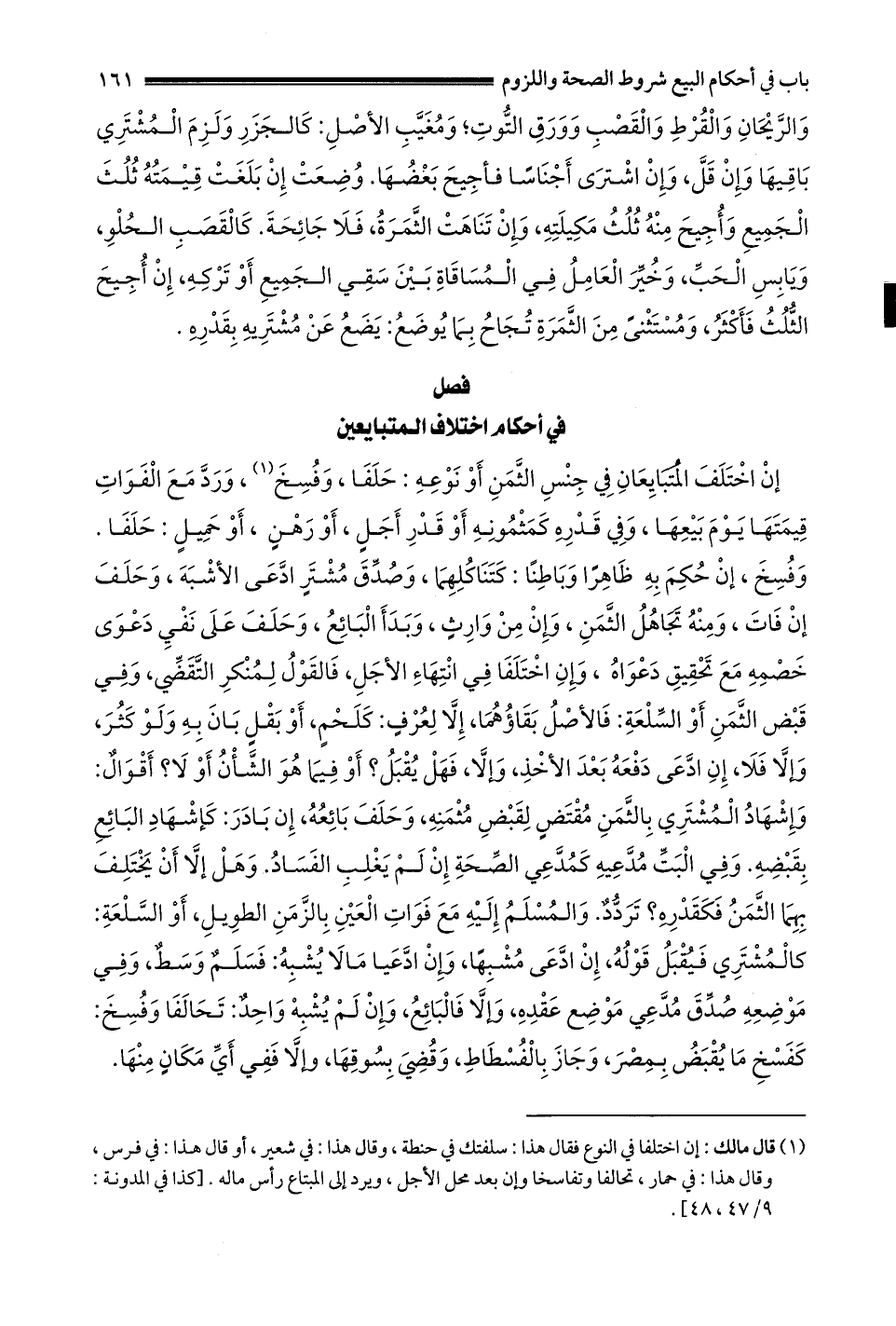 إنْ اخْتَلَفَ الْمُتَبَايِعَانِ فِي جِنْسِ الثَّمَنِ أَوْ نوعه: حلفا وفسخ1 ورد مع الفوات قيمتها يوم بيعها وَفِي قَدْرِهِ كَمَثْمُونِهِ أَوْ قَدْرِ أَجَلٍ أَوْ رهن أو حميل: حلفا وَفُسِخَ إنْ حَكَمَ بِهِ ظَاهِرًا وَبَاطِنًا: كَتَنَاكُلِهِمَا وَصُدِّقَ مُشْتَرٍ ادَّعَى الْأَشْبَهَ وَحَلَفَ إنْ فَاتَ ومنه تجاهل الثمن وإن من وارث وبدأ البائع وَحَلَفَ عَلَى نَفْيِ دَعْوَى خَصْمِهِ مَعَ تَحْقِيقِ دعواه وَإِنْ اخْتَلَفَا فِي انْتِهَاءِ الْأَجَلِ فَالْقَوْلُ لِمُنْكِرِ التقضي وَفِي قَبْضِ الثَّمَنِ أَوْ السِّلْعَةِ: فَالْأَصْلُ بَقَاؤُهُمَا إلا لعرف: كَلَحْمٍ أَوْ بَقْلٍ بَانَ بِهِ وَلَوْ كَثُرَ وإلا فلا إن اجعى دفعه بعد الأخذ وإلا فهل يقبل؟ أَوْ فِيمَا هُوَ الشَّأْنُ أَوْ لَا؟ أَقْوَالٌ: وَإِشْهَادُ الْمُشْتَرِي بِالثَّمَنِ مُقْتَضٍ لِقَبْضِ مُثَمَّنِهِ وَحَلَفَ بائعه إن بادر: كإشهاد البائع بقبضه وفي البت مدعيه كمدعي الصحة إن لم يغلب الفساد وَهَلْ إلَّا أَنْ يَخْتَلِفَ بِهِمَا الثَّمَنُ فَكَقَدْرِهِ؟ تردد وَالْمُسْلَمُ إلَيْهِ مَعَ فَوَاتِ الْعَيْنِ بِالزَّمَنِ الطَّوِيلِ أو السلعة: كالمشتري فَيُقْبَلُ قَوْلُهُ إنْ ادَّعَى مُشَبَّهًا وَإِنْ ادَّعَيَا مالا يشبه: فسلم وسط وَفِي مَوْضِعِهِ صُدِّقَ مُدَّعِي مَوْضِعِ عَقْدِهِ وَإِلَّا فَالْبَائِعُ وَإِنْ لَمْ يُشْبِهْ وَاحِدٌ: تَحَالَفَا وَفُسِخَ: كفسخ ما يقبض بمصر وجاز بالفسطاط وقضي بسوقها وإلا ففي أي مكان منها.
