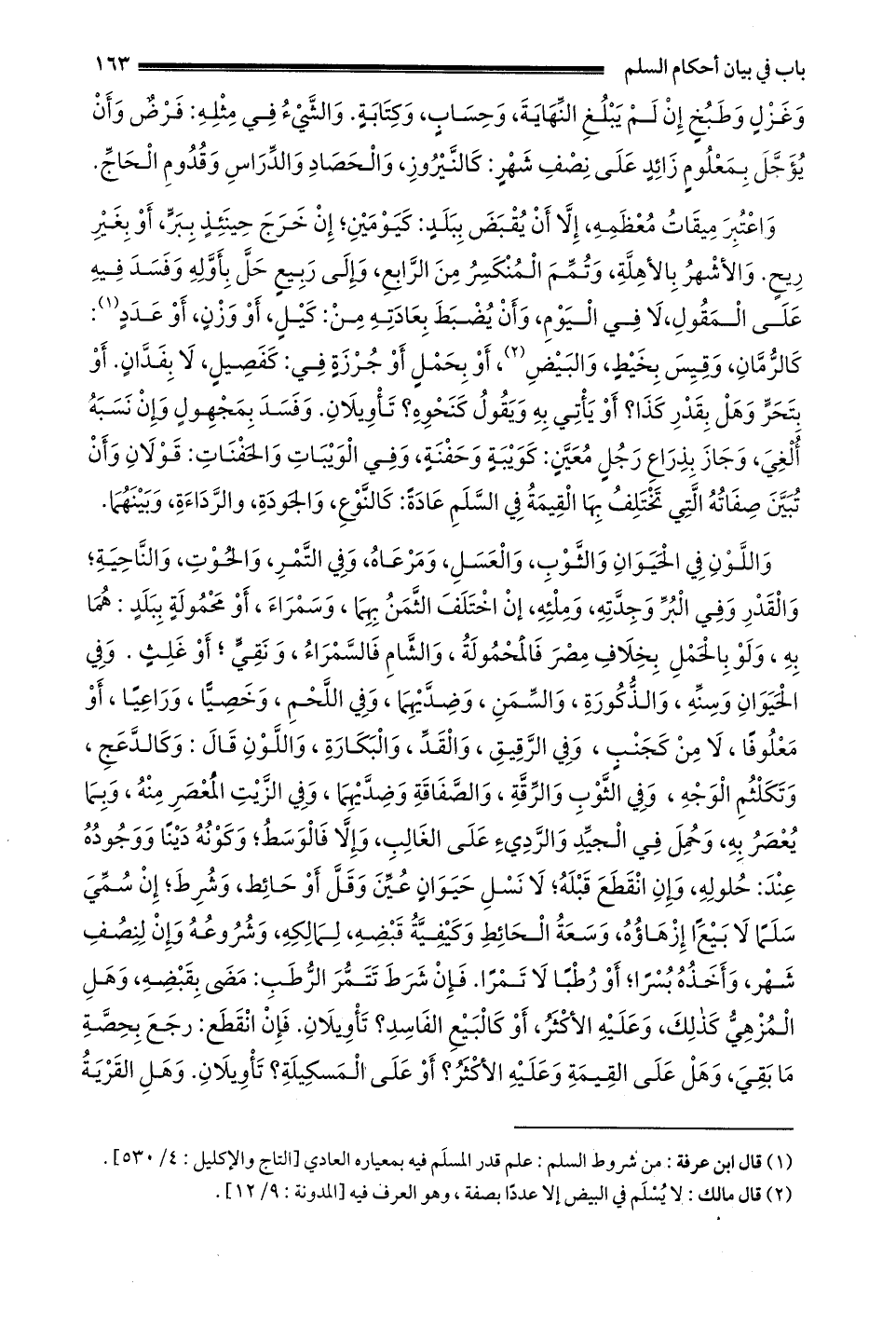 واعتبر ميقات معظمه إلَّا أَنْ يُقْبَضَ بِبَلَدٍ: كَيَوْمَيْنِ إنْ خَرَجَ حينئذ ببر أو بغير ريح والأشهر بالأهلة وتمم المنكسر من الرابع وإلى ربيع حل بأوله وفسد فيه على المقول لا في اليوم وَأَنْ يُضْبَطَ بِعَادَتِهِ مِنْ: كَيْلٍ أَوْ وَزْنٍ أو عدد1: كالرمان وقيس بخيط والبيض2 أو بحمل أو جرزة في: كفصيل لا بفدان أَوْ بِتَحَرٍّ وَهَلْ بِقَدْرِ كَذَا؟ أَوْ يَأْتِي به ويقول كنحوه؟ تأويلان وفسد بمجهول وإن نسبه ألغي وجاز بذراع رجل معين: كويبة وحفنة وفي الويبات والحفنات: قولان وَأَنْ تُبَيَّنَ صِفَاتُهُ الَّتِي تَخْتَلِفُ بِهَا الْقِيمَةُ فِي السَّلَمِ عَادَةً: كَالنَّوْعِ وَالْجَوْدَةِ وَالرَّدَاءَةِ وَبَيْنَهُمَا.