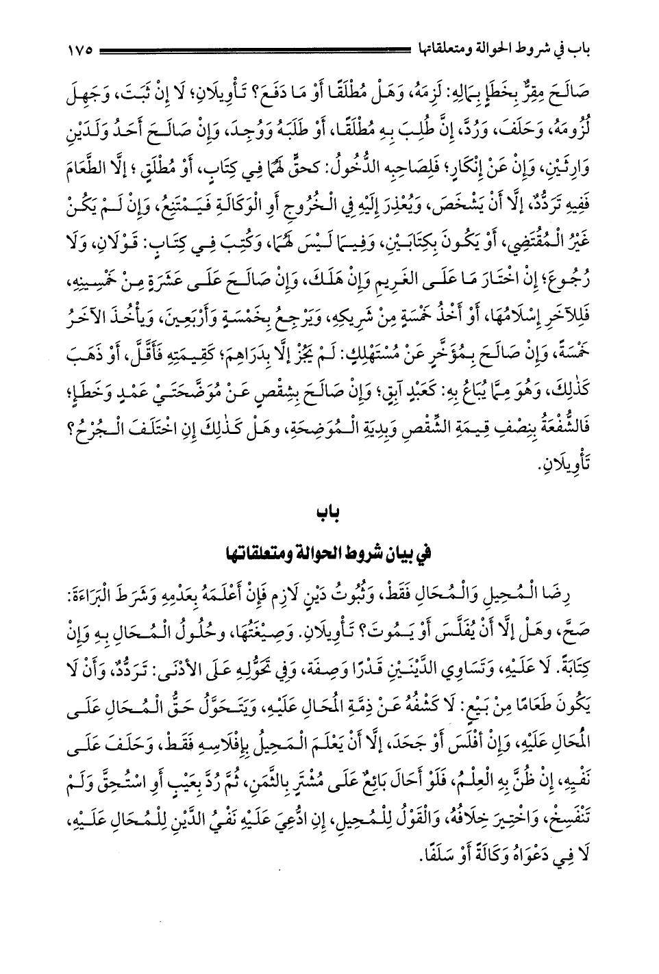 رضا المحيل والمحال فقط وثبوت دين لازم فإن أعلمه بعدمه وشرط البراءة: صح وَهَلْ إلَّا أَنْ يُفْلِسَ أَوْ يَمُوتَ؟ تَأْوِيلَانِ وصيغتها وحلول المحال به وإن كتابة لا عليه وتساوي الدينين قدرا وصفة وفي تحوله على الأدنى: تردد وأن لا يكون طعاما من بيع: لا كشفه عن ذمة المحال عليه ويتحول حق المحال على المحال عليه وإن أفلس أو جحد إلا أن يعلم المحيل بإفلاسه فقط وَحَلَفَ عَلَى نَفْيِهِ إنْ ظَنَّ بِهِ الْعِلْمَ فلو أحئل بَائِعٌ عَلَى مُشْتَرٍ بِالثَّمَنِ ثُمَّ رُدَّ بِعَيْبٍ أو استحق ولم تنفسخ واختير خلافه وَالْقَوْلُ لِلْمُحِيلِ إنْ ادَّعَى عَلَيْهِ نَفْيَ الدَّيْنِ للمحال عليه لا في دعواه وكالة أو سلفا.