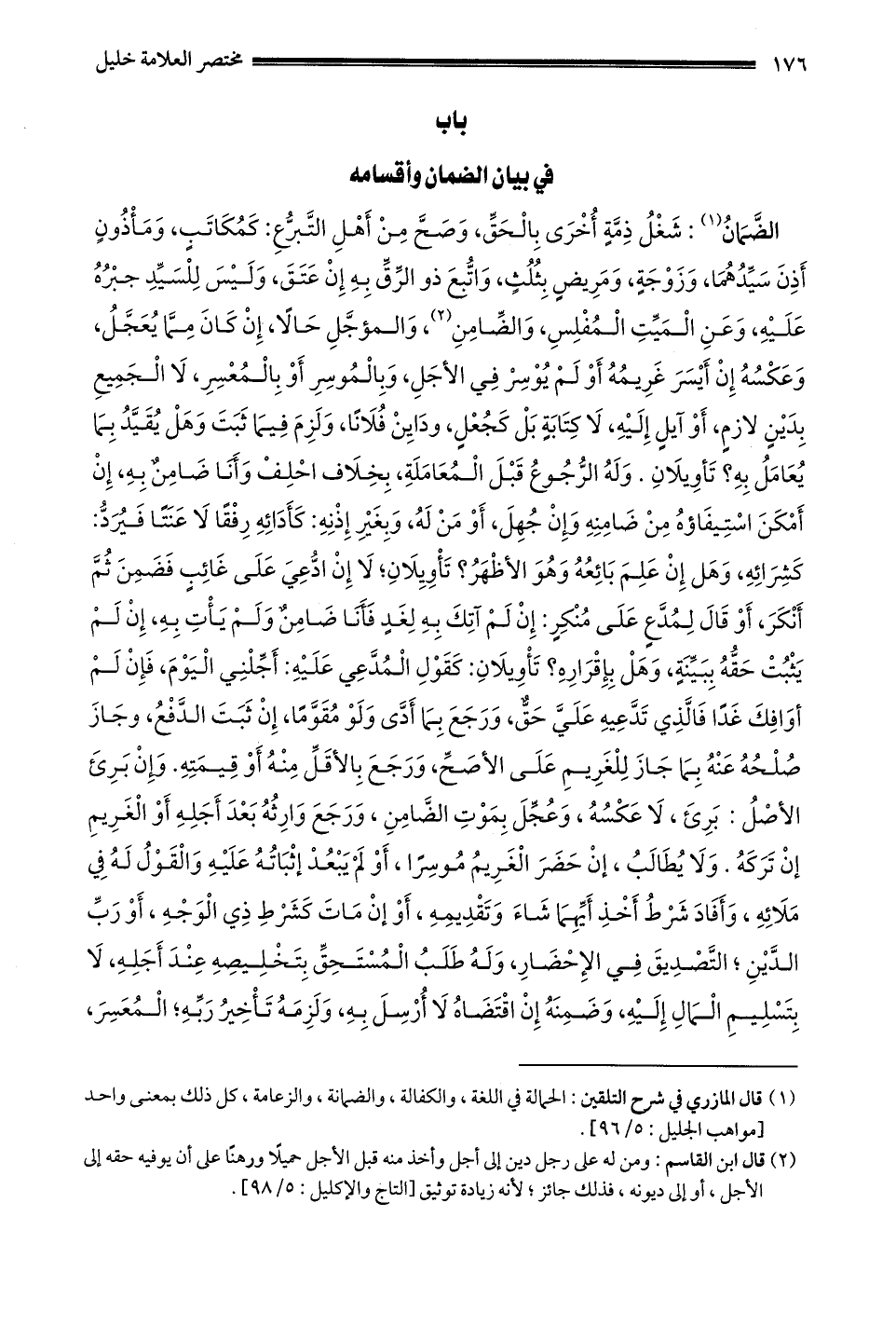 الضمان1: شغل ذمة أخرى بالحق وصح من أهل التبرع: كمكاتب ومأذون أذن سيدهما وزوجة ومريض بثلث واتبع ذو الرق به إن عتق وليس للسيد جبره عليه وعن الميت خلمفلس والضامن2 والمؤجل حالا إن كان مما يعجل وَعَكْسُهُ إنْ أَيْسَرَ غَرِيمُهُ أَوْ لَمْ يُوسِرْ في الأجل وبالموسر أو بالمعسر لا الجميع بدين لازم أو آيل إليه لا كتابة بل كجعل وداين فلانا ولزم فيما ثبت وهل يقيد بما يعامل به؟ تأويلان وله الرجوع قبل المعاملة بخلاف احلف وأنا ضامن به إنْ أَمْكَنَ اسْتِيفَاؤُهُ مِنْ ضَامِنِهِ وَإِنْ جُهِلَ أو من له وبغير إذنه كأدائه رفقا لا عنتا فيرد: كَشِرَائِهِ وَهَلْ إنْ عَلِمَ بَائِعُهُ وَهُوَ الْأَظْهَرُ؟ تأويلان لَا إنْ ادَّعَى عَلَى غَائِبٍ فَضَمِنَ ثُمَّ أنكر أَوْ قَالَ لِمُدَّعٍ عَلَى مُنْكِرٍ: إنْ لَمْ آتِك بِهِ لِغَدٍ فَأَنَا ضَامِنٌ وَلَمْ يَأْتِ به إن لم يثبت حقه ببينة وهل بإقراره؟ تأويلان: كَقَوْلِ الْمُدَّعَى عَلَيْهِ: أَجِّلْنِي الْيَوْمَ فَإِنْ لَمْ أوافك غدا فالذي تدعيه علي حق وَرَجَعَ بِمَا أَدَّى وَلَوْ مُقَوَّمًا إنْ ثَبَتَ الدفع وجاز صلحه عنه بما جاز للغريم على الأصح ورجع بالأقل منه أو قيمته وإن برىء الأصل: برىء لا عكسه وعجل بموت الضامن ورجع وارثه بعد أجله أو الغريم إن تركه ولا يطالب إن حضر الغريم موسرا أو لم يبعد إثباته عليه وَالْقَوْلُ لَهُ فِي مِلَائِهِ وَأَفَادَ شَرْطُ أَخْذِ أيهما شاء وتقديمه أو إن مات كَشَرْطِ ذِي الْوَجْهِ أَوْ رَبِّ الدَّيْنِ التَّصْدِيقَ في الإحضار وله طلب المستحق بتخليصه عند أجله لَا بِتَسْلِيمِ الْمَالِ إلَيْهِ وَضَمِنَهُ إنْ اقْتَضَاهُ لا أرسل به ولزمه تأخير ربه المعسر