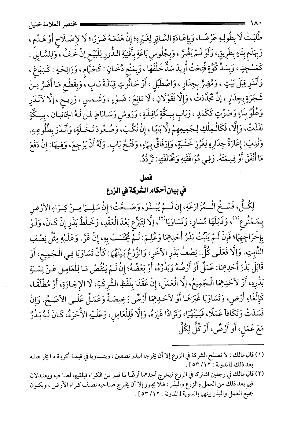 1- قال مالك: لا تصلح الشركة في الزرع إلا أن يخرجا البذر نصفين ويتساويا في قيمة أكرية ما يخرجانه بعد ذلك [المدونة: 12 / 53] .