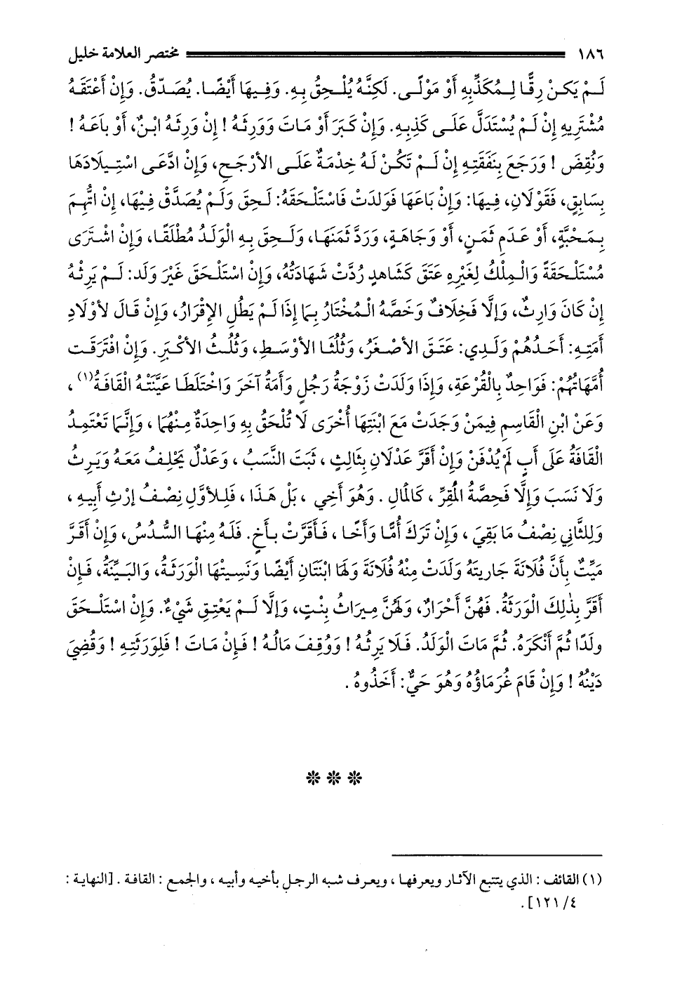 لم يكن رقا لمكذبه أو مولى لكنه يلحق به وَفِيهَا أَيْضًا يُصَدَّقُ وَإِنْ أَعْتَقَهُ مُشْتَرِيهِ إنْ لم يستدل على كذبه وَإِنْ كَبِرَ أَوْ مَاتَ وَوَرِثَهُ! إنْ وَرِثَهُ ابن أَوْ بَاعَهُ وَنَقَضَ وَرَجَعَ بِنَفَقَتِهِ إنْ لَمْ تكن له خدمة على الأرجح وإن ادعى آستيلادها بسابق فقولان فيها: وَإِنْ بَاعَهَا فَوَلَدَتْ فَاسْتَلْحَقَهُ: لَحِقَ وَلَمْ يُصَدَّقْ فِيهَا إنْ اُتُّهِمَ بِمَحَبَّةٍ أَوْ عَدَمِ ثَمَنٍ أَوْ وَجَاهَةٍ وَرَدَّ ثَمَنَهَا وَلَحِقَ بِهِ الْوَلَدُ مطلقا وإن اشترى مستلحقة والملك لغيره عتق كشاهد ردت شهادته وَإِنْ اسْتَلْحَقَ غَيْرَ وَلَدٍ: لَمْ يَرِثْهُ إنْ كان وارث وإلا فخلاف وَخَصُّهُ الْمُخْتَارُ بِمَا إذَا لَمْ يَطُلْ الْإِقْرَارُ وَإِنْ قَالَ لِأَوْلَادِ أَمَتِهِ أَحَدُهُمْ وَلَدِي: عَتَقَ الْأَصْغَرُ وَثُلُثَا الْأَوْسَطِ وَثُلْثَ الْأَكْبَرِ وَإِنْ افْتَرَقَتْ أمهاتهم: فواحد بالقرعة وَإِذَا وَلَدَتْ زَوْجَةُ رَجُلٍ وَأَمَةٍ آخَرَ وَاخْتَلَطَا عينته القافة1 وَعَنْ ابْنِ الْقَاسِمِ فِيمَنْ وُجِدَتْ مَعَ ابْنَتِهَا أخرى لا تلحق به واحدة منهما وَإِنَّمَا تَعْتَمِدُ الْقَافَةُ عَلَى أَبٍ لَمْ يُدْفَنْ وإن أقر عدلان بثالث ثبت النسب وعدل يحلف معه ويرث ولا نسب وإلا فحصة المقر كالمال وَهَذَا أَخِي بَلْ هَذَا فَلِلْأَوَّلِ نِصْفُ إرْثِ أبيه وللثاني نصف ما بقي وَإِنْ تَرَكَ أُمًّا وَأَخًا فَأَقَرَّتْ بِأَخٍ فَلَهُ منها السدس وَإِنْ أَقَرَّ مَيِّتٌ بِأَنَّ فُلَانَةَ جَارِيَتَهُ وَلَدَتْ مِنْهُ فُلَانَةَ وَلَهَا ابْنَتَانِ أَيْضًا وَنَسِيَتَهَا الْوَرَثَةُ وَالْبَيِّنَةُ فَإِنْ أَقَرَّ بِذَلِكَ الْوَرَثَةُ فَهُنَّ أَحْرَارٌ وَلَهُنَّ مِيرَاثُ بِنْتٍ وَإِلَّا لَمْ يَعْتِقْ شَيْءٌ وَإِنْ اسْتَلْحَقَ وَلَدًا ثُمَّ أَنْكَرَهُ ثُمَّ مَاتَ الْوَلَدُ فَلَا يَرِثُهُ وَوَقَفَ مَالَهُ فَإِنْ مَاتَ فلورثته وقضي دَيْنَهُ وَإِنْ قَامَ غُرَمَاؤُهُ وَهُوَ حَيٌّ: أَخَذُوهُ.