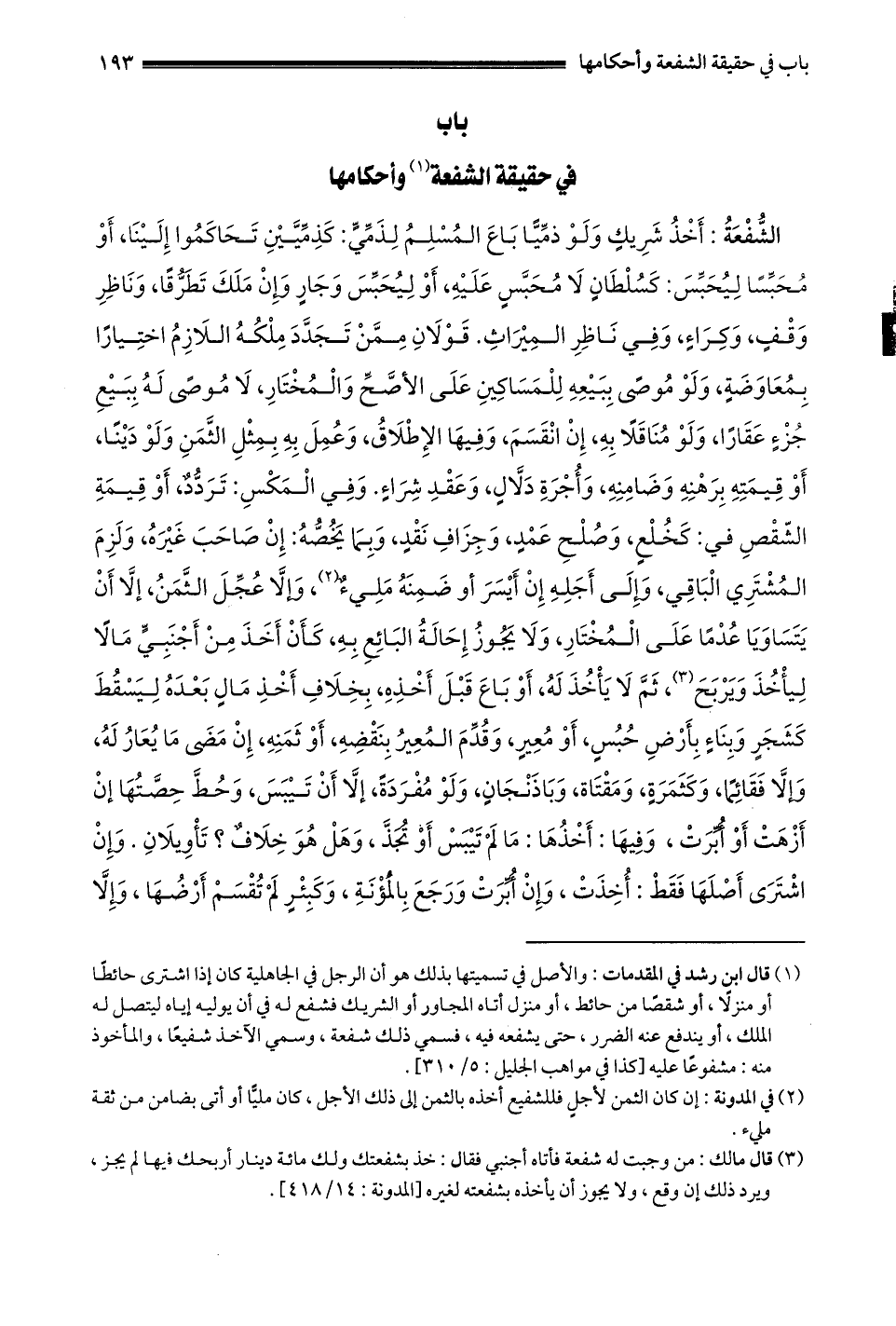 الشفعة: أخذ شريك وَلَوْ ذِمِّيًّا بَاعَ الْمُسْلِمُ لِذِمِّيٍّ: كَذِمِّيِّينَ تَحَاكَمُوا إلينا أو محبسا ليحبس: كسلطان لا محبس عليه أو ليحبس وجار وإن ملك تطرفا وناظر وقف وكراء وفي ناظر الميراث قولان ممن تجدد ملكه اللازم اختيارا بمعاوضة ولو موصى ببيعه للمساكين على الأصح والمختار لا موصى له ببيع جزء عقارا ولو مناقلا به إن انقسم وفيها الإطلاق وعمل به بمثل الثمن ولو دينا أو قيمته بِرَهْنِهِ وَضَامِنِهِ وَأُجْرَةِ دَلَّالٍ وَعَقْدِ شِرَاءٍ وَفِي المكس: تردد أَوْ قِيمَةِ الشِّقْصِ فِي: كَخُلْعٍ وَصُلْحٍ عَمْدٍ وجزاف نقد وَبِمَا يَخُصُّهُ: إنْ صَاحَبَ غَيْرَهُ وَلَزِمَ الْمُشْتَرِيَ الباقي وَإِلَى أَجَلِهِ إنْ أَيْسَرَ أَوْ ضَمِنَهُ مَلِيءٌ2 وَإِلَّا عَجَّلَ الثَّمَنَ إلَّا أَنْ يَتَسَاوَيَا عَدَمًا على المختار ولا يجوز إحالة البائع به كأن أخذ من أجنبي مالا ليأخذ ويربح3 ثم لا يأخذ له أَوْ بَاعَ قَبْلَ أَخْذِهِ بِخِلَافِ أَخْذِ مَالٍ بعده ليسقط كشجر وبناء بأرض حبس أو معير وَقُدِّمَ الْمُعِيرُ بِنَقْضِهِ أَوْ ثَمَنِهِ إنْ مَضَى ما يعار له وإلا فقائما وكثمرة ومقتاة وباذنجان ولو مفردة إلا أن تيبس وحط حصتها إن أزهت أو أبرت وَفِيهَا: أَخَذَهَا: مَا لَمْ تَيْبَسْ أَوْ تُجَذَّ وهل هو خلاف؟ تأويلان وَإِنْ اشْتَرَى أَصْلَهَا فَقَطْ: أُخِذَتْ وَإِنْ أُبِّرَتْ ورجع بالمؤنة وكبئر لم تقسم أرضها وإلا