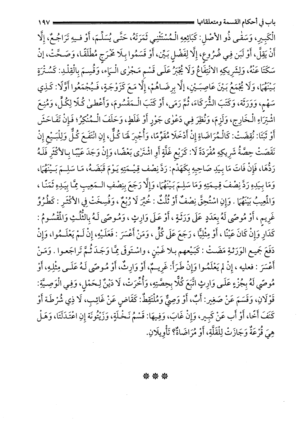 الكبير وَسَقَى ذُو الْأَصْلِ: كَبَائِعِهِ الْمُسْتَثْنَى ثَمَرَتُهُ حَتَّى يسلم أو فيه تراجع إلا أن يقل أَوْ لَبَنٍ فِي ضُرُوعٍ إلَّا لِفَضْلٍ بَيِّنٍ أو قسموا بلا مخرج مطلقا وصحت إن سكتا عنه ولشريكه الانتفاع ولا يجبر على قسم مجرى الماء وقسم بالقلد: كسترة بينهما وَلَا يُجْمَعُ بَيْنَ عَاصِبَيْنِ إلَّا بِرِضَاهُمْ إلَّا مع كزوجة فيجمعوا أولا: كذي سهم وورثة وكيتب الشُّرَكَاءَ ثُمَّ رَمَى أَوْ كَتَبَ الْمَقْسُومَ وَأَعْطَى كلا لكل ومنع اشتراء الخارج ولزم ونظر في دعوى جورأو غَلَطٍ وَحَلَفَ الْمُنْكِرُ فَإِنْ تَفَاحَشَ أَوْ ثَبَتَا نقضت: كالمراضاة إن أدخلا مقوما وأجبر لها كل إن انتفع كل وللبيع إن نقصت حصة شريكه مفردة لا: كربع غلة أو اشترى بعضا وإن وجد عيبا بالأكثر فله ردها فَإِنْ فَاتَ مَا بِيَدِ صَاحِبِهِ بِكَهَدْمٍ: رَدَّ نصف قيمته يوم قبضه ما سلم بينهما وَمَا بِيَدِهِ رَدَّ نِصْفَ قِيمَتِهِ وَمَا سَلِمَ بينهما وَإِلَّا رَجَعَ بِنِصْفِ الْمَعِيبِ مِمَّا بِيَدِهِ ثَمَنًا والمعيب بينهما وإن استحق نصف أو ثلث: خير لا ربع وفسخت في الأكثر: كَطُرُوِّ غَرِيمٍ أَوْ مُوصًى لَهُ بِعَدَدٍ عَلَى وَرَثَةٍ أَوْ عَلَى وَارِثٍ وَمُوصًى لَهُ بِالثُّلُثِ والمقسوم: كدار وَإِنْ كَانَ عَيْنًا أَوْ مِثْلِيًّا رَجَعَ عَلَى كُلٍّ وَمَنْ أَعْسَرَ: فَعَلَيْهِ إنْ لَمْ يَعْلَمُوا وإن دفع جميع الورثة مضت: كبيعهم بلا غبن واستوفى مما وجد ثم تراجعوا ومن أعسر: فعليه إن لم يعلموا وَإِنْ طَرَأَ: غَرِيمٌ أَوْ وَارِثٌ أَوْ مُوصًى لَهُ عَلَى مِثْلِهِ أَوْ مُوصًى لَهُ بِجُزْءٍ على وارث اتبع كلا بحصته وَأُخِّرَتْ لَا دَيْنٌ لِحَمْلٍ وَفِي الْوَصِيَّةِ: قَوْلَانِ وَقَسَمَ عَنْ صَغِيرِ: أَبٌ أَوْ وَصِيٌّ وَمُلْتَقِطٌ: كقاض عن غائب لَا ذِي شُرْطَةٍ أَوْ كَنَفَ أَخًا أَوْ أب عن كبير وإن غاب وفيها: قسم نخلة وزيتونة إن اعتدلتا وهل هي قرعة وجازت للقلة أو مراضاة؟ تأويلان.