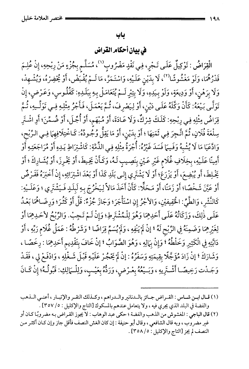 1- قال ابن شاس: القراض جائز بالدنانير والدراهم وكذلك النقر والإتبار أعني الهذب والفضة في البلد الذي يجري فيه ولا يتعامل عندهم بالمسكوك [التاج والإكليل: 5 / 357] .