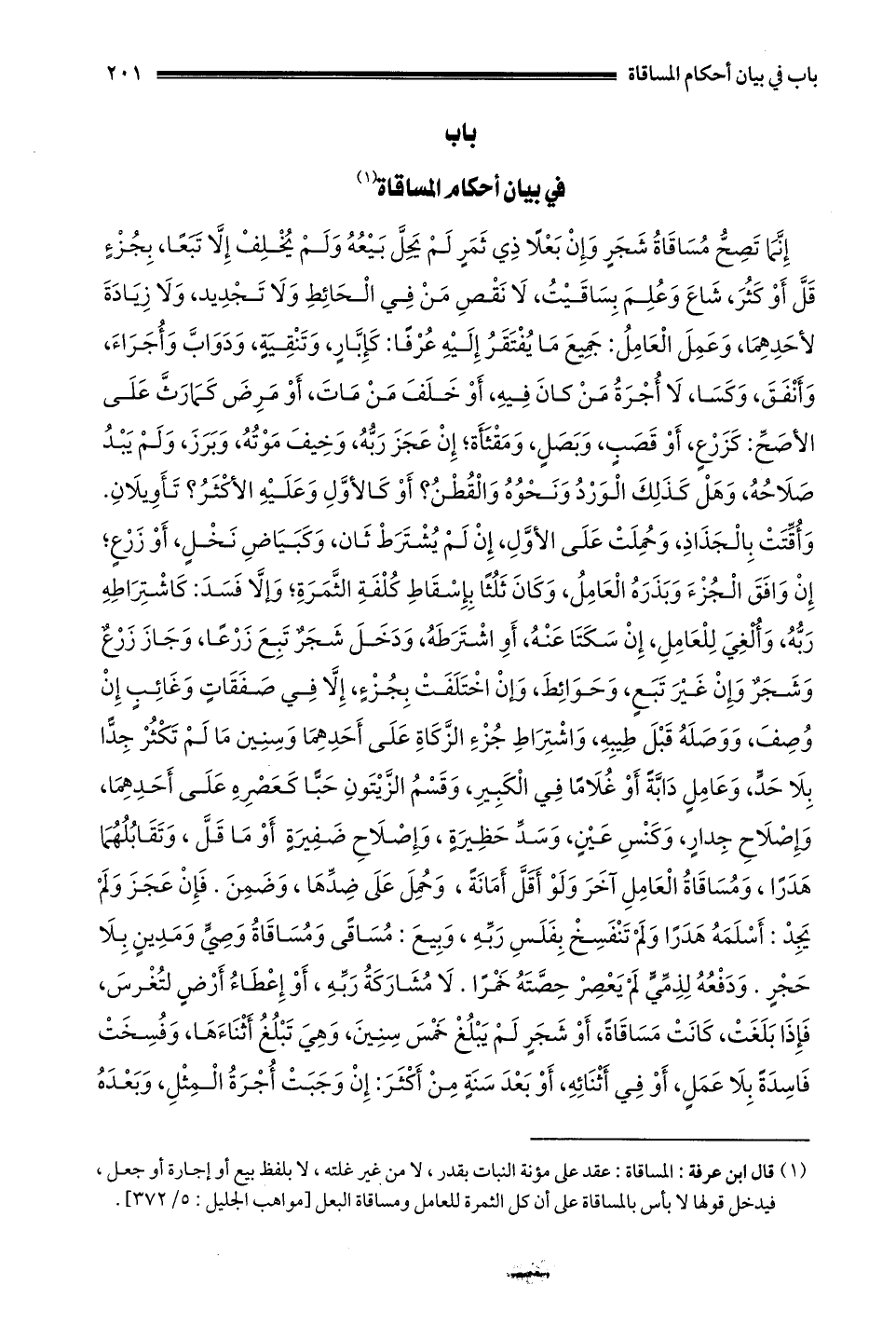 1 - قال ابن عرفة: المساقاة: عقد على مُؤْنَةِ النَّبَاتِ بِقَدْرٍ لَا مِنْ غَيْرِ غَلَّتِهِ لا بلفظ بيع أو إجازة أَوْ جُعْلٍ فَيَدْخُلُ قَوْلُهَا لَا بَأْسَ بِالْمُسَاقَاةِ على أن كل الثمرة للعامل ومساقاة البعل [مواهب الجليل: 5 / 372] .