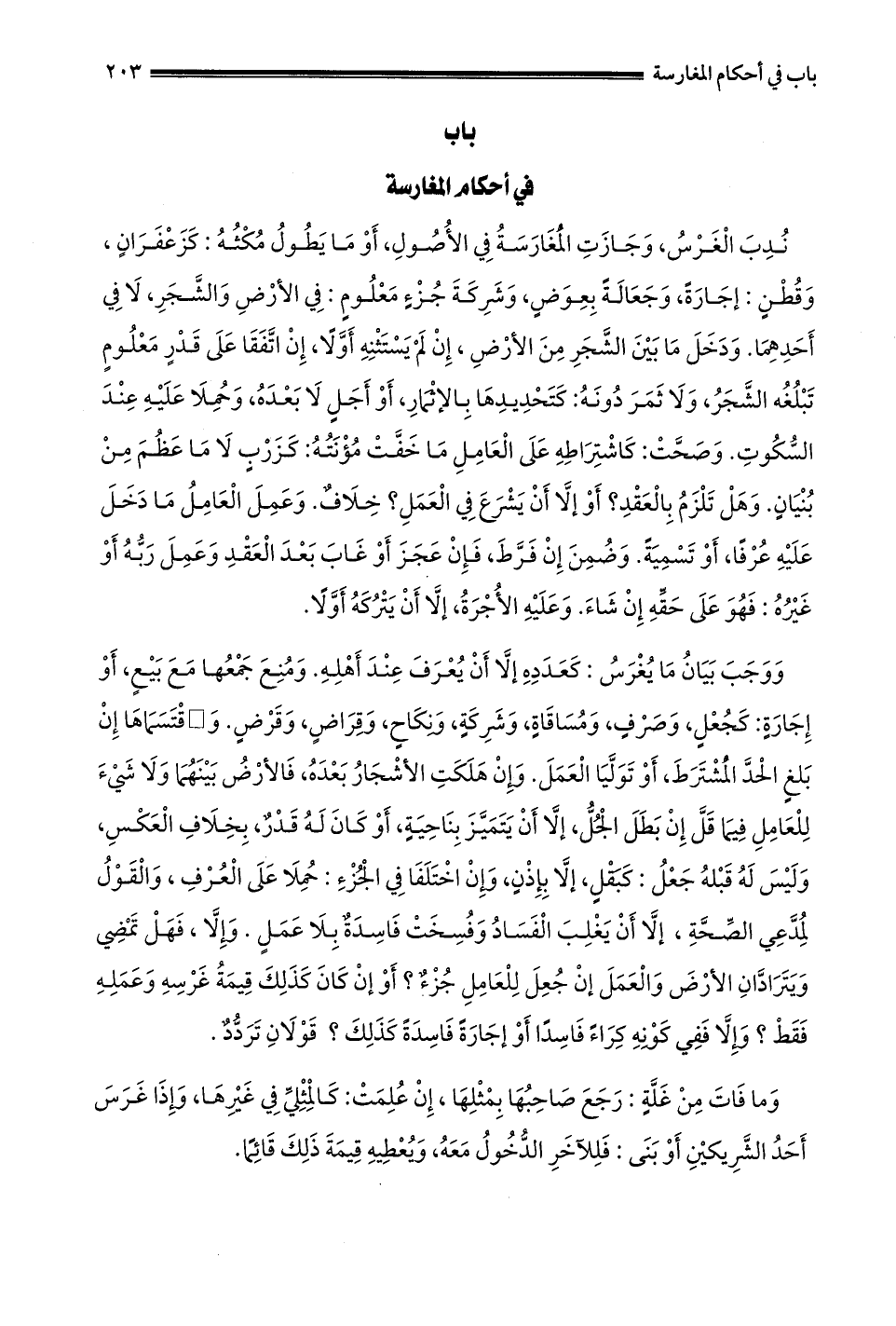 ندب الغرس وجازت المغارسة في الأصول أو ما يطول مكثه: كزعفران وقطن: إجارة وجعالة بعوض وشركة جزء معلوم: في الأرض والشجر لا في أحدهما ودخل ما بين الشجر من الأرض إن لم يستثنه أولا إن اتفقا على قدر معلو تبلغه الشجر ولا ثمر دونه: كتحديدها بالإثمار أو أجل لا بعده وحملا عليه عند السكوت وصحت: كاشتراطه على العامل ما خفت مؤتته: كزرب لا ما عظم من بنيان وهل تلزم بالعقد؟ أو إلا أن يشرع في العمل؟ خلاف وعمل العامل ما دخل عليه عرفا أو تسمية وضمن إن فرط فإن عجز أو غاب بعد العقد وعمل ربه أو غيره: فهو على حقه إن شاء وعليه الأجرة إلا أن يتركه أولا.