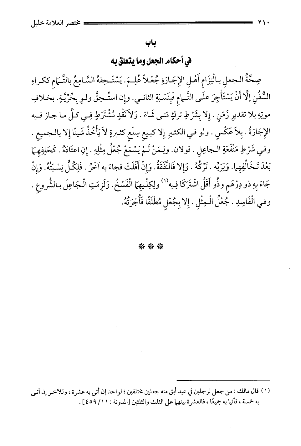 صحة الجعل بالتزام أهل الإجارة جعلا علم يستحقه السامع بالتمام ككراء السفن إلَّا أَنْ يَسْتَأْجِرَ عَلَى التَّمَامِ فَبِنِسْبَةِ الثَّانِي وإن استحق ولو بحرية بخلاف موته بِلَا تَقْدِيرِ زَمَنٍ إلَّا بِشَرْطٍ تُرِكَ مَتَى شاء ولا نقد مشترط فِي كُلِّ مَا جَازَ فِيهِ الْإِجَارَةُ بِلَا عكس وَلَوْ فِي الْكَثِيرِ إلَّا كَبَيْعِ سِلَعٍ كَثِيرَةٍ لا يأخذ شيئا إلا بالجميع وفي شرط منفعة الجاعل قولان وَلِمَنْ لَمْ يَسْمَعْ جُعْلُ مِثْلِهِ إنْ اعْتَادَهُ كحلفهما بعد تخالفهما ولربه تركه وإلا فالنفقة وإن أفلت فجاء به آخر فلكل نسبته وَإِنْ جَاءَ بِهِ ذُو دِرْهَمٍ وَذُو أَقَلَّ اشتركا فيه1 ولكليهما الفسخ ولزمت الجاعل بالشروع وَفِي الْفَاسِدِ جُعْلُ الْمِثْلِ إلَّا بِجُعْلٍ مُطْلَقًا فأجرته.