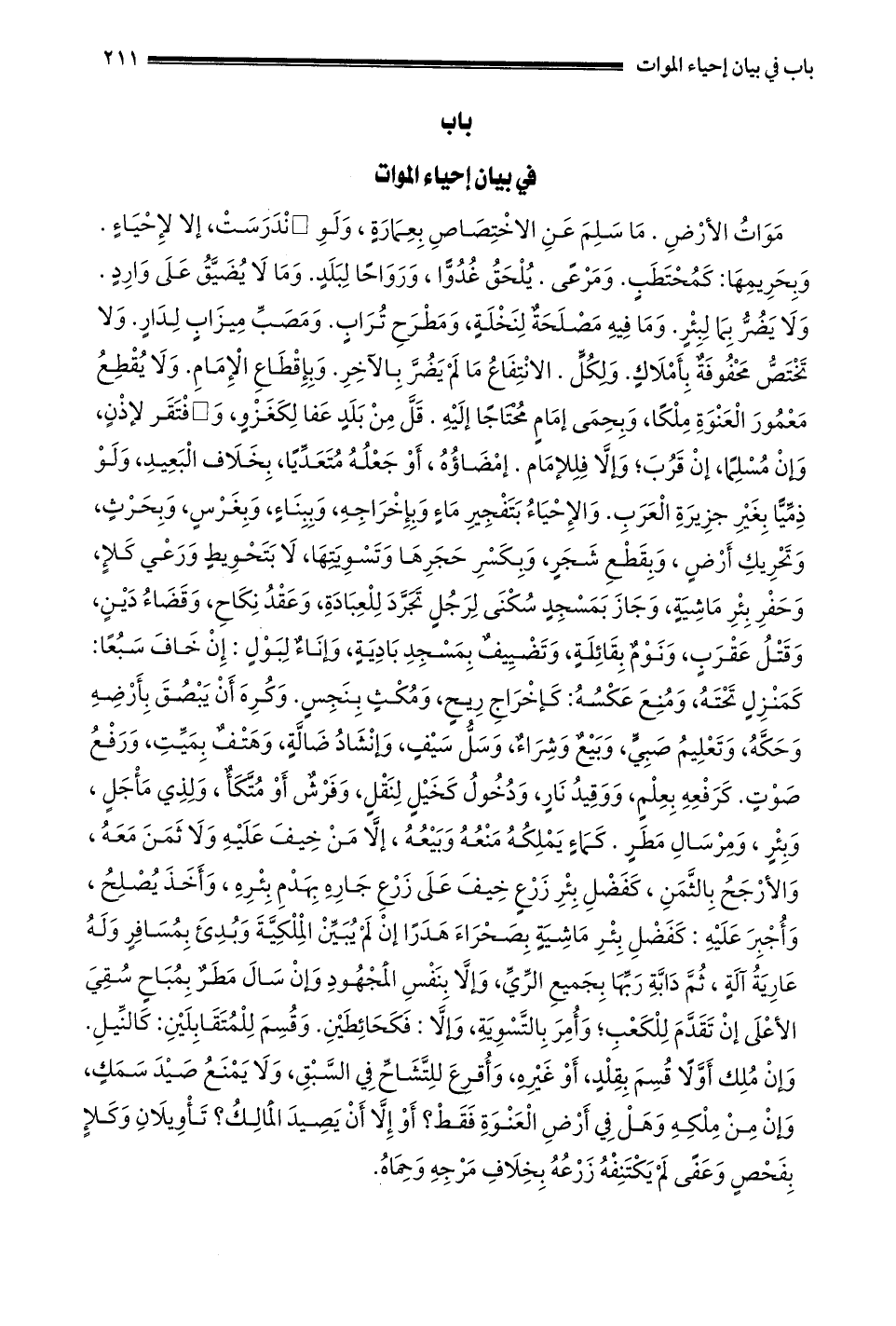 موات الأرض ما سلم عن الاختصاض بعمارة ولو اندرست إلاص لإحياء وَبِحَرِيمِهَا: كَمُحْتَطَبٍ وَمَرْعًى يَلْحَقُ غُدُوًّا وَرَوَاحًا لِبَلَدٍ وَمَا لَا يُضَيِّقُ عَلَى وَارِدٍ وَلَا يَضُرُّ بما لبئر وما فيه مصلحة لنخلة ومطرح تراب ومصب ميزاب لدار ولا تختص محفوفة بأملاك ولكل الانتفاع ما لم يضر بالآخر وبإقطاع الإمام ولا يقطع معمور العنوة ملكا وَبِحِمَى إمَامٍ مُحْتَاجًا إلَيْهِ قَلَّ مِنْ بَلَدٍ عفعا لكغزو وَافْتَقَرَ لِإِذْنٍ وَإِنْ مُسْلِمًا إنْ قَرُبَ وَإِلَّا فَلِلْإِمَامِ إمْضَاؤُهُ أَوْ جَعْلُهُ مُتَعَدِّيًا بِخِلَافِ الْبَعِيدِ ولو ذميا بغير جزيرة العرب وَالْإِحْيَاءُ بِتَفْجِيرِ مَاءٍ وَبِإِخْرَاجِهِ وَبِبِنَاءٍ وَبِغَرْسٍ وَبِحَرْثٍ وتحريك أرض وبقطع شجر وَبِكَسْرِ حَجَرِهَا وَتَسْوِيَتِهَا لَا بِتَحْوِيطٍ وَرَعْيِ كَلَإٍ وحفر بئر ماشية وجاز بمسجد سكنى لرجل تجرد للعبادة وَعَقْدُ نِكَاحٍ وَقَضَاءُ دَيْنٍ وَقَتْلُ عَقْرَبٍ وَنَوْمٌ بِقَائِلَةٍ وَتَضْيِيفٌ بِمَسْجِدِ بَادِيَةٍ وَإِنَاءٌ لِبَوْلٍ: إنْ خاف سبعا: كمنزل تحته ومنع عكسه: كإخراج ريح ومكث بنجس وكره أن يبصق بأرضه وحكه وَتَعْلِيمُ صَبِيٍّ وَبَيْعٌ وَشِرَاءٌ وَسَلُّ سَيْفٍ وَإِنْشَادُ ضَالَّةٍ وَهَتْفٌ بِمَيِّتٍ وَرَفْعُ صَوْتٍ كَرَفْعِهِ بِعَلَمٍ وَوَقِيدُ نَارٍ وَدُخُولٌ كَخَيْلٍ لِنَقْلٍ وَفَرْشٌ أَوْ متكأ وَلِذِي مَأْجَلٍ وَبِئْرٍ وَمِرْسَالِ مَطَرٍ كَمَاءٍ يَمْلِكُهُ منعه وبيعه إلَّا مَنْ خِيفَ عَلَيْهِ وَلَا ثَمَنَ مَعَهُ والأرجح بالثمن كَفَضْلِ بِئْرِ زَرْعٍ خِيفَ عَلَى زَرْعِ جَارِهِ بهدم بئره وأخذ يصلح وأجبر عليه: كَفَضْلِ بِئْرِ مَاشِيَةٍ بِصَحْرَاءَ هَدَرًا إنْ لَمْ يبين الملكية وبدىء بمسافر وله على الحاضر عارية آلة ثم حاضر ثم دابة ربها بجميع الري وإلا بنفس المجهود وَإِنْ سَالَ مَطَرٌ بِمُبَاحٍ سَقَى الْأَعْلَى إنْ تقدم للكعب وأمر صاحب الأعلى بالتسوية وإلا: فكحائطين وقسم للمتقابلين: كالنيل وإن ملك أولا قسم بقلد أو غيره وأقرع للتشاح في السبق وَلَا يُمْنَعُ صَيْدُ سَمَكٍ وَإِنْ مِنْ مِلْكِهِ وَهَلْ فِي أَرْضِ الْعَنْوَةِ فَقَطْ؟ أَوْ إلَّا أن يصيد المالك؟ تأويلان وكلإ بِفَحْصٍ وَعَفَاءٍ لَمْ يَكْتَنِفْهُ زَرْعُهُ بِخِلَافِ مَرْجِهِ وحماه.