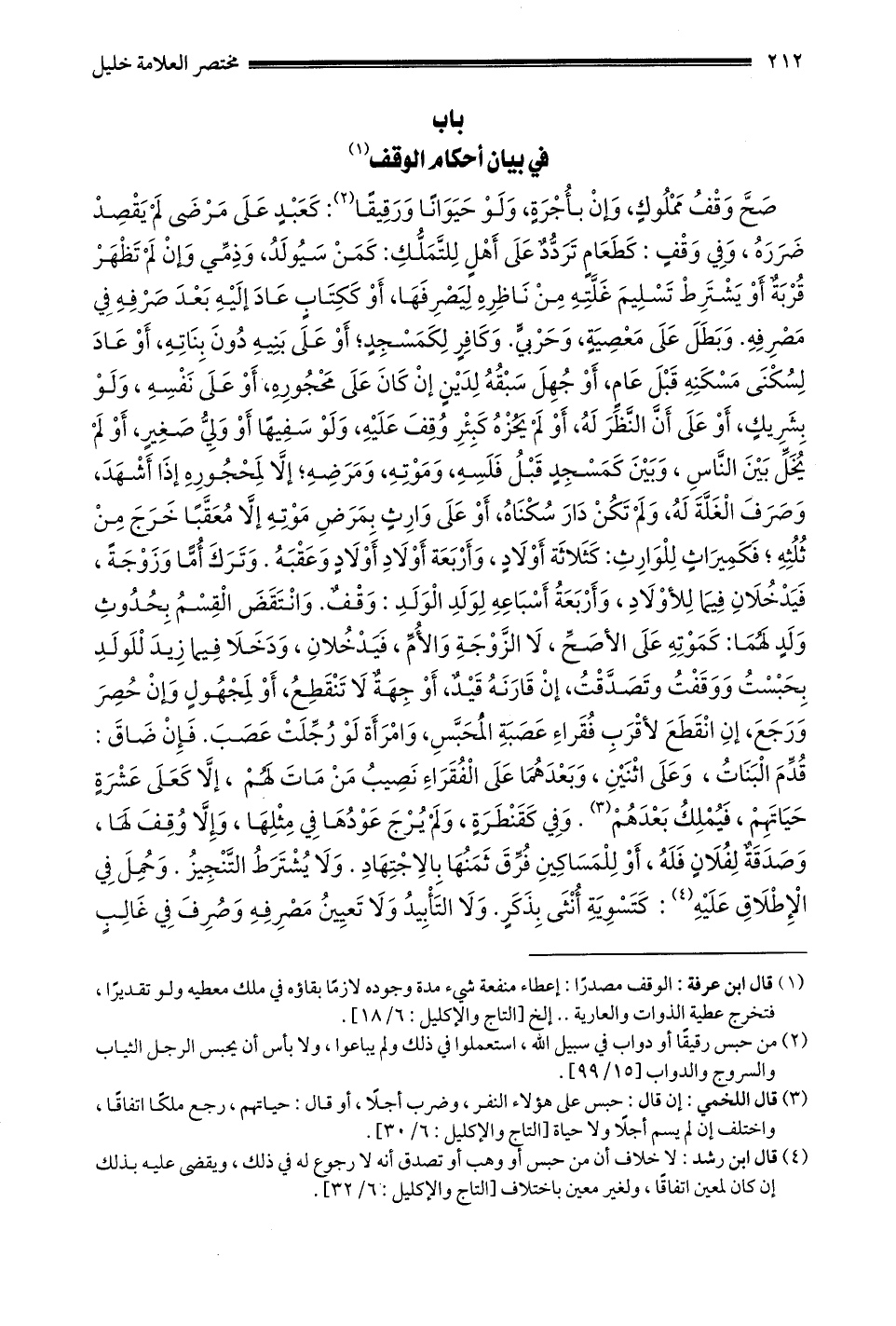 1- قال ابن عرفة: الوقف مصدرا: إعطاء منفعة شي مُدَّةَ وُجُودِهِ لَازِمًا بَقَاؤُهُ فِي مِلْكِ مُعْطِيهِ ولو تقديرا فتخرج عطية الذوات والعارية ... إلخ [التاج والإكليل: 6 / 18] .