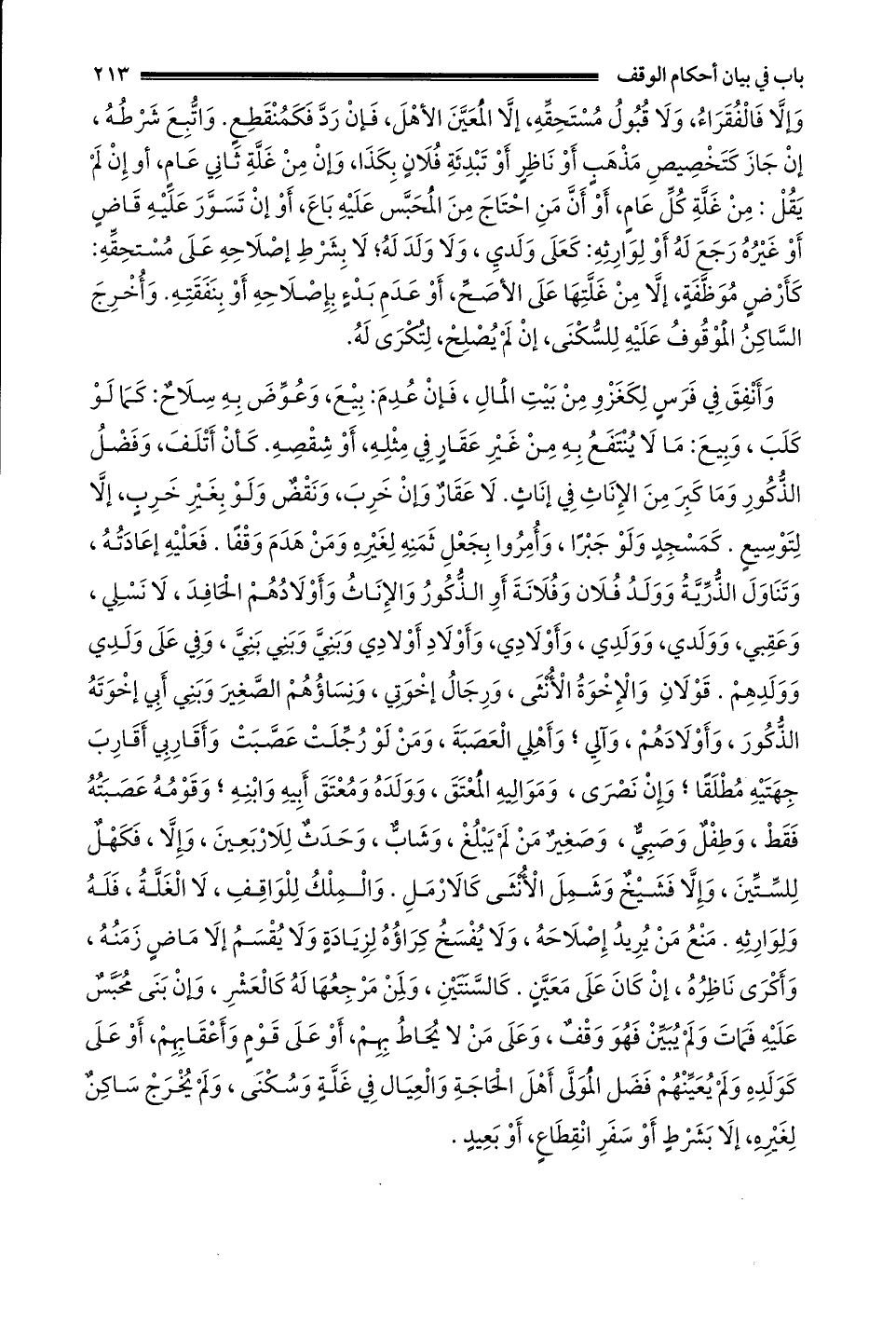 وَأُنْفِقَ فِي فَرَسٍ لِكَغَزْوٍ مِنْ بَيْتِ الْمَالِ فإن عدم: بيع وعوض به سلاح: كما لو كلب وَبِيعَ: مَا لَا يُنْتَفَعُ بِهِ مِنْ غَيْرِ عقار في مثله أو شقصه كأن أتلف وَفَضْلُ الذُّكُورِ وَمَا كَبِرَ مِنْ الْإِنَاثِ فِي إناث لا عقار وإن خرب ونقض ولو بغير خرب إلا لتوسيع كمسجد ولو جبرا وأمروا بجعل ثمنه لغيره ومن هدم وقفا فعليه إعادته وتناول الذرية وولد فُلَانٌ وَفُلَانَةُ أَوْ الذُّكُورُ وَالْإِنَاثُ وَأَوْلَادُهُمْ الْحَافِدَ لا نسلي وعقبي وولدي وولدي وأولادي وأولاد أولادي وبني وبني بني وفي على ولدي وولدهم قولان وَالْإِخْوَةُ الْأُنْثَى وَرِجَالُ إخْوَتِي وَنِسَاؤُهُمْ الصَّغِيرَ وَبَنِي أَبِي إخْوَتَهُ الذُّكُورَ وَأَوْلَادَهُمْ وَآلِي وَأَهْلِي الْعَصَبَةَ ومن لو رجلت عصبت وأقاربي أقارب جهتيه مطلقا وإن نصرى ومواليه المعتق وولده ومعتق أبيه وابنه وقومه عصبته فقط وطفل وصبي وصغير من لَمْ يَبْلُغْ وَشَابٌّ وَحَدَثٌ لِلْأَرْبَعِينَ وَإِلَّا فَكَهْلٌ للستين وإلا فشيخ وشمل كل واحد من طفل وما بعده الأنثى ك الأرمل والملك للواقف لا الغلة فله ولوارثه منع من يريد إصلاحه ولا يفسخ كراؤه لزيادة ولا يقسم إلا ماض زمنه وَأَكْرَى نَاظِرُهُ إنْ كَانَ عَلَى مُعَيَّنٍ كَالسَّنَتَيْنِ ولمن مرجعها له كالعشر وإن بنى محبس عليه فمات ولم يبين فهو وقف وَعَلَى مَنْ لَا يُحَاطُ بِهِمْ أَوْ عَلَى قَوْمٍ وَأَعْقَابِهِمْ أَوْ عَلَى كَوَلَدِهِ وَلَمْ يُعَيِّنْهُمْ فضل المولى أهل الحاجة والعيال في غلة وسكنى وَلَمْ يَخْرُجْ سَاكِنٌ لِغَيْرِهِ إلَّا بِشَرْطٍ أَوْ سفر انقطاع أو بعيد.