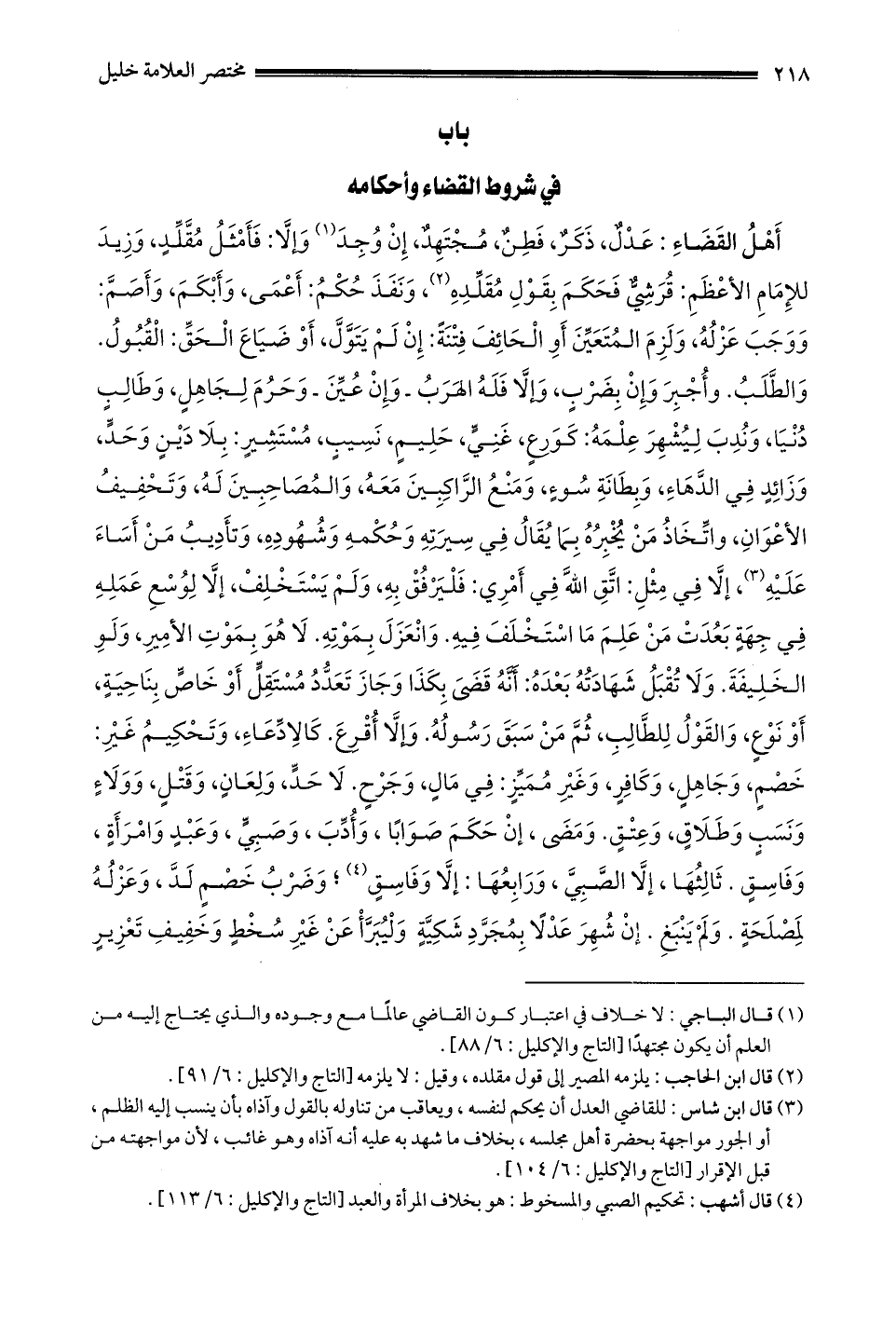 أهل القضاء: عدل ذكر فطن مجتهد إن وجد1 وإلا: فأمثل مقلد وزيد للإمام الأعظم: قرشي فحكم بقول مقلده2 وَنَفَذَ حُكْمُ: أَعْمَى وَأَبْكَمَ وَأَصَمَّ: وَوَجَبَ عَزْلُهُ ولزم المتعين أو الحائف فِتْنَةً: إنْ لَمْ يَتَوَلَّ أَوْ ضَيَاعَ الْحَقِّ: القبول والطلب وأجبر وإن بضرب وإلا فله الهرب - وإن عين - وحرم لجاهل وطالب دنيا وندب ليشهر علمه: كَوَرِعٍ غَنِيٍّ حَلِيمٍ نَزِهٍ نَسِيبٍ مُسْتَشِيرٍ: بِلَا دَيْنٍ وَحَدٍّ وَزَائِدٍ فِي الدَّهَاءِ وَبِطَانَةِ سُوءٍ ومنع الراكبين معه والمصاحبين له وتحفيف الأعوان واتخاذ من يجبره بما يقال في سيرته وحكمه وشهوده وَتَأْدِيبُ مَنْ أَسَاءَ عَلَيْهِ3 إلَّا فِي مِثْلِ اتق الله في أمري: فليرفق به وَلَمْ يَسْتَخْلِفْ إلَّا لِوُسْعِ عَمَلِهِ فِي جِهَةٍ بعدت من علم ما استخلف فيه وَانْعَزَلَ بِمَوْتِهِ لَا هُوَ بِمَوْتِ الْأَمِيرِ وَلَوْ الخليفة وَلَا تُقْبَلُ شَهَادَتُهُ بَعْدَهُ: أَنَّهُ قَضَى بِكَذَا وَجَازَ تَعَدُّدُ مُسْتَقِلٍّ أَوْ خَاصٍّ بِنَاحِيَةٍ أَوْ نوع وَالْقَوْلُ لِلطَّالِبِ ثُمَّ مَنْ سَبَقَ رَسُولُهُ وَإِلَّا أقرع كالادعاء وَتَحْكِيمُ غَيْرِ: خَصْمٍ وَجَاهِلٍ وَكَافِرٍ وَغَيْرِ مُمَيِّزٍ: في مال وجرح لا حد ولعان وقتل وولاء ونسب وطلاق وعتق ومضى إن حكم صوابا وأدب وصبي وَعَبْدٍ وَامْرَأَةٍ وَفَاسِقٍ ثَالِثُهَا إلَّا الصَّبِيَّ وَرَابِعُهَا إلا وفاسق4 وضرب خصم لد وَعَزْلُهُ لِمَصْلَحَةٍ وَلَمْ يَنْبَغِ إنْ شُهِرَ عَدْلًا بمجرد شكية وليبرأ عن غير سخط وخفيف تعزير