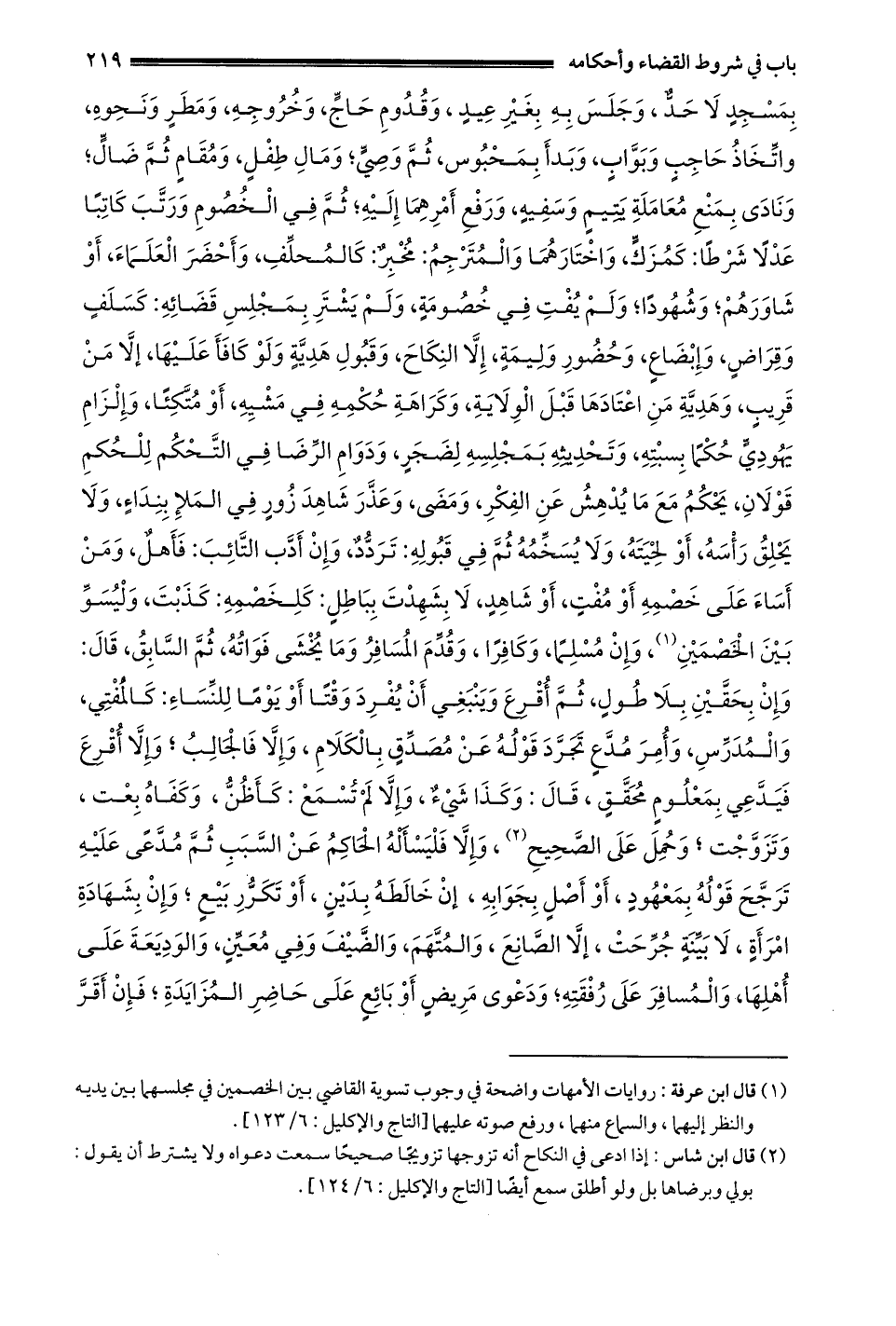 بمسجد لا حد وَجَلَسَ بِهِ بِغَيْرِ عِيدٍ وَقُدُومِ حَاجٍّ وَخُرُوجِهِ ومطر ونحوه واتخاذ حاجب وبواب وَبَدَأَ بِمَحْبُوسٍ ثُمَّ وَصِيٍّ وَمَالِ طِفْلٍ وَمَقَامٍ ثم ضال وَنَادَى بِمَنْعِ مُعَامَلَةِ يَتِيمٍ وَسَفِيهٍ وَرَفَعَ أَمْرَهُمَا إليه ثم في الخصوم وَرَتَّبَ كَاتِبًا عَدْلًا شَرْطًا: كَمُزَكٍّ وَاخْتَارَهُمَا وَالْمُتَرْجِمُ: مخبر: كالمحلف وأحضر العلماء أو شاورهمم وشهودا وَلَمْ يُفْتِ فِي خُصُومَةٍ وَلَمْ يَشْتَرِ بِمَجْلِسِ قَضَائِهِ: كَسَلَفٍ وَقِرَاضٍ وَإِبْضَاعٍ وَحُضُورِ وَلِيمَةٍ إلَّا النكاح وَقَبُولُ هَدِيَّةٍ وَلَوْ كَافَأَ عَلَيْهَا إلَّا مِنْ قريب وهدية مَنْ اعْتَادَهَا قَبْلَ الْوِلَايَةِ وَكَرَاهَةِ حُكْمِهِ فِي مَشْيِهِ أَوْ مُتَّكِئًا وَإِلْزَامِ يَهُودِيٍّ حُكْمًا بِسَبْتِهِ وَتَحْدِيثِهِ بِمَجْلِسِهِ لِضَجَرٍ وَدَوَامِ الرِّضَا فِي التَّحْكِيمِ للحكم قولان وَلَا يَحْكُمُ مَعَ مَا يُدْهِشُ عَنْ الْفِكْرِ ومضى وعذر شاهد زور في الملإ بنداء ولا يحلق رأسه أو لحيته ولا يسخمه ثُمَّ فِي قَبُولِهِ تَرَدُّدٌ وَإِنْ أُدِبَّ التَّائِبُ: فأهل وَمَنْ أَسَاءَ عَلَى خَصْمِهِ أَوْ مُفْتٍ أَوْ شاهد لا بشهدت بباطل: كلخصمه: كذبت وليسو بين الخصمين1 وإن مسلما وكافرا وَقَدَّمَ الْمُسَافِرَ وَمَا يَخْشَى فَوَاتَهُ ثُمَّ السَّابِقَ قَالَ: وَإِنْ بِحَقَّيْنِ بِلَا طُولٍ ثُمَّ أَقْرَعَ وَيَنْبَغِي أَنْ يُفْرِدَ وَقْتًا أَوْ يَوْمًا لِلنِّسَاءِ: كالمفتي والمدرس وَأَمْرُ مُدَّعٍ تَجَرَّدَ قَوْلُهُ عَنْ مُصَدِّقٍ بِالْكَلَامِ وإلا فالجالب وإلا أقرع فيدعي بمعلوم محقق قال: وكذا شيء وإلا لم تسمع: كأظن وَكَفَاهُ بِعْت وَتَزَوَّجْت وَحُمِلَ عَلَى الصَّحِيحِ2 وَإِلَّا فليسأله الحاكم عن السبب ثُمَّ مُدَّعًى عَلَيْهِ تَرَجَّحَ قَوْلِهِ بِمَعْهُودٍ أَوْ أصل بجوابه إنْ خَالَطَهُ بِدَيْنٍ أَوْ تَكَرُّرِ بَيْعٍ وَإِنْ بشهادة امرأة لا بينة جرحت إلَّا الصَّانِعَ وَالْمُتَّهَمَ وَالضَّيْفَ وَفِي مُعَيَّنٍ وَالْوَدِيعَةَ عَلَى أَهْلِهَا وَالْمُسَافِرَ عَلَى رُفْقَتِهِ وَدَعْوَى مَرِيضٍ أو بائع على حاضر المزايدة فإن أقر