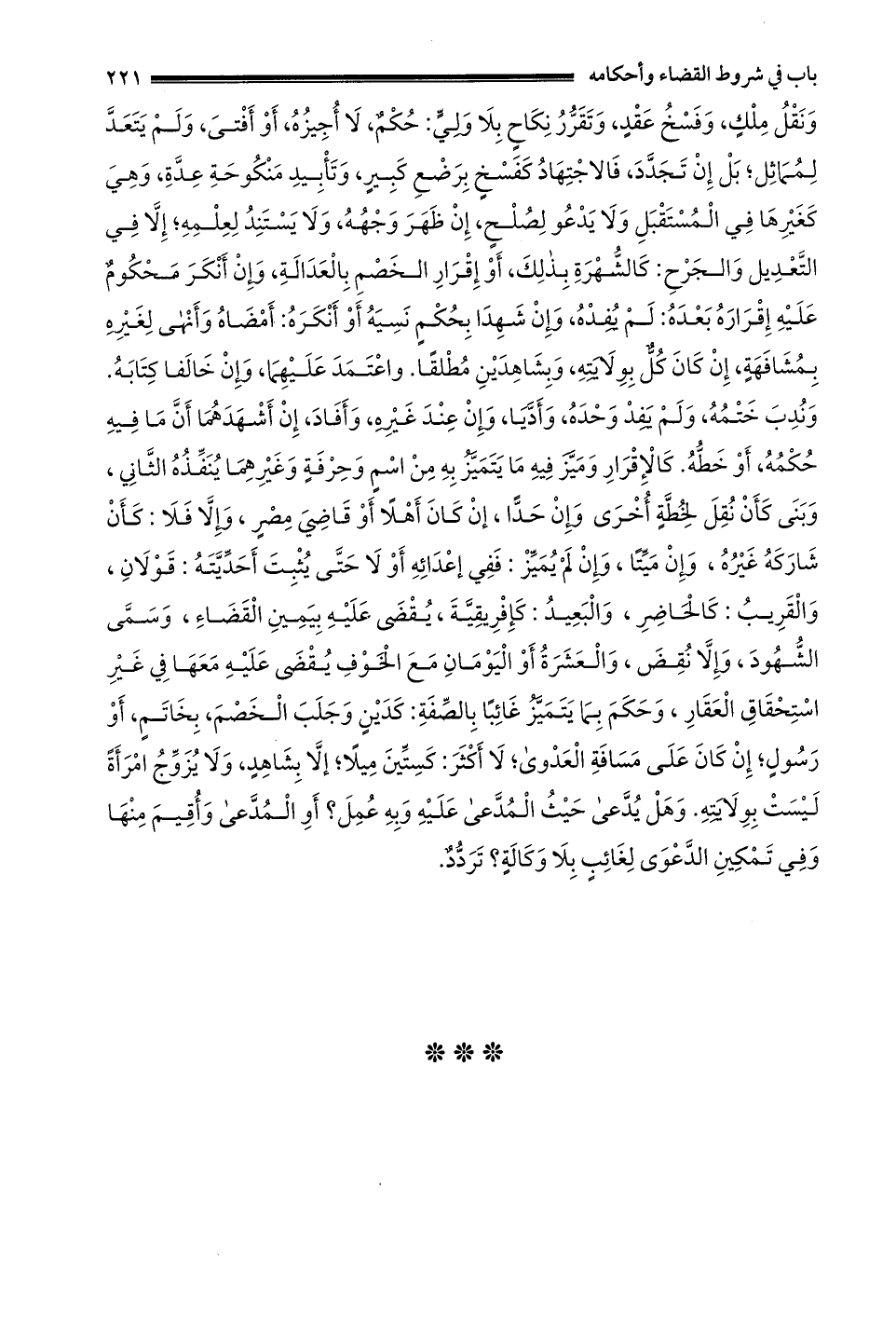 ونقل ملك وفسخ عقد وتقرر نكاح بلا ولي: حكم لا أجيزه أو أفتى وَلَمْ يَتَعَدَّ لِمُمَاثِلٍ بَلْ إنْ تَجَدَّدَ فَالِاجْتِهَادُ كفسخ برضع كبير وتأبيد منكوحة عدة وهي كغيرها في المستقبل ولا يدعو لصلح إن ظهر وجهه وَلَا يَسْتَنِدُ لِعِلْمِهِ إلَّا فِي التَّعْدِيلِ وَالْجَرْحِ: كالشهرة بذلك أو إقرار الخصم بالعدالة وَإِنْ أَنْكَرَ مَحْكُومٌ عَلَيْهِ إقْرَارَهُ بَعْدَهُ لَمْ يفده وَإِنْ شَهِدَا بِحُكْمٍ نَسِيَهُ أَوْ أَنْكَرَهُ: أَمْضَاهُ وَأَنْهَى لِغَيْرِهِ بِمُشَافَهَةٍ إنْ كَانَ كُلٌّ بِوِلَايَتِهِ وبشاهدين مطلقا وَاعْتَمَدَ عَلَيْهِمَا وَإِنْ خَالَفَا كِتَابَهُ وَنَدْبُ خَتْمِهِ ولم يفد وحده وأديا وإن عند غيره وَأَفَادَ إنْ أَشْهَدَهُمَا أَنَّ مَا فِيهِ حُكْمُهُ أو خطه كالإقراري وَمَيَّزَ فِيهِ مَا يَتَمَيَّزُ بِهِ مِنْ اسْمٍ وحرفة وغيرهما ينفذ الثاني وبنى كأن نقل لخطة أخرى وَإِنْ حَدًّا إنْ كَانَ أَهْلًا أَوْ قَاضِيَ مصر وإلا فلا: كأن شاركه غيره وإن ميتا وإن لم يميز: ففي إعدائه أو لا حتى يثبت أحديته: قولان والقريب: كالحاضر والبعيد: كإفريقية يقضى عليه بيمين القضاء وسمى الشهود وإلا نقض والعشرة أَوْ الْيَوْمَانِ مَعَ الْخَوْفِ يُقْضَى عَلَيْهِ مَعَهَا في غير استحقاق العقار وحكم بما يتميز غائبا بالصفة: كدين وَجَلَبَ الْخَصْمَ بِخَاتَمٍ أَوْ رَسُولٍ إنْ كَانَ عَلَى مَسَافَةِ الْعَدْوَى لَا أَكْثَرَ: كَسِتِّينَ مِيلًا إلا بشاهد ولا يزوج امرأة ليست بولايته وَهَلْ يَدَّعِي حَيْثُ الْمُدَّعَى عَلَيْهِ وَبِهِ عُمِلَ؟ أو المدعى وأقيم منها وَفِي تَمْكِينِ الدَّعْوَى لِغَائِبٍ بِلَا وَكَالَةٍ؟ تَرَدُّدٌ.
