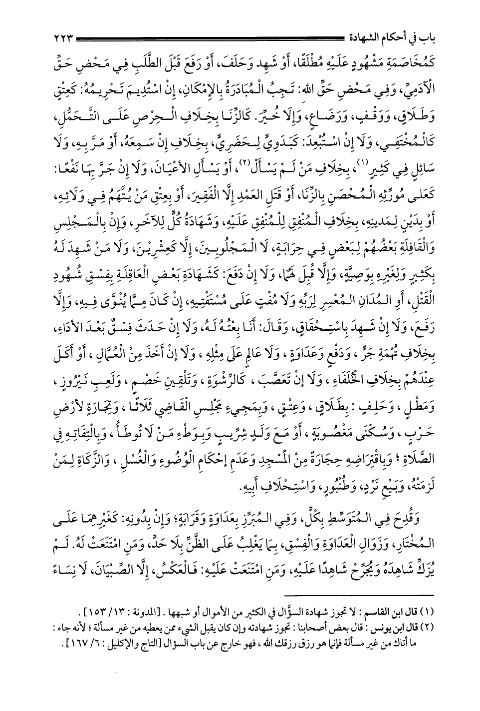 كمخاصمة مشهود عليه مطلقا أو شهل وحلف أَوْ رَفَعَ قَبْلَ الطَّلَبِ فِي مَحْضِ حَقِّ الآدمي وَفِي مَحْضِ حَقِّ اللَّهِ: تَجِبُ الْمُبَادَرَةُ بِالْإِمْكَانِ إنْ اُسْتُدِيمَ تَحْرِيمُهُ: كَعِتْقٍ وَطَلَاقٍ وَوَقْفٍ وَرَضَاعٍ وإلا خير كالزنا بخلاف الحرص على التحمل كالمختفي وَلَا إنْ اُسْتُبْعِدَ: كَبَدْوِيٍّ لِحَضَرِيٍّ بِخِلَافِ إنْ سمعه أو مر به وَلَا سَائِلٍ فِي كَثِيرٍ1 بِخِلَافِ مَنْ لَمْ يسأل2 أو يسأل الأعيان ولا إن جر بها نفعا: كعلى مورثه المحصن بالزنا أو قتل العمد إلا الفقير أو بعتق من يتهم في ولائه أو بدين لمدينه بخلاف المنفق للمنفق عليه وشهادة كل للآخر وإن بالمجلس والقافلة بعضهم لبعض في حرابة لا المجلوبين إلا كعشرين وَلَا مَنْ شَهِدَ لَهُ بِكَثِيرٍ وَلِغَيْرِهِ بِوَصِيَّةٍ وإلا قبل لهما وَلَا إنْ دَفَعَ: كَشَهَادَةِ بَعْضِ الْعَاقِلَةِ بِفِسْقِ شهود القتل أو المدان المعسر لربه وَلَا مُفْتٍ عَلَى مُسْتَفْتِيهِ إنْ كَانَ مِمَّا ينوى فيه وإلا رفع وَلَا إنْ شَهِدَ بِاسْتِحْقَاقٍ وَقَالَ: أَنَا بِعْته له ولا إن حدث فسق بعد الأداء بخلاف تهمة جر ودفع وعداوة ولا عالم على مثله وَلَا إنْ أَخَذَ مِنْ الْعُمَّالِ أَوْ أَكَلَ عندهم بخلاف الخلفاء وَلَا إنْ تَعَصَّبَ كَالرِّشْوَةِ وَتَلْقِينِ خَصْمٍ وَلِعْبِ نيروز ومطل وحلف: بطلاق وعتق وبمجي مجلس القاضي ثلاثا وَتِجَارَةٍ لِأَرْضِ حَرْبٍ وَسُكْنَى مَغْصُوبَةٍ أَوْ مَعَ وَلَدِ شِرِّيبٍ وَبِوَطْءِ مَنْ لَا تُوطَأُ وَبِالْتِفَاتِهِ فِي الصَّلَاةِ وَبِاقْتِرَاضِهِ حِجَارَةً مِنْ الْمَسْجِدِ وَعَدَمِ إحْكَامِ الْوُضُوءِ وَالْغُسْلِ وَالزَّكَاةِ لِمَنْ لَزِمَتْهُ وَبَيْعِ نرد وطنبور واستحلاف أبيه.