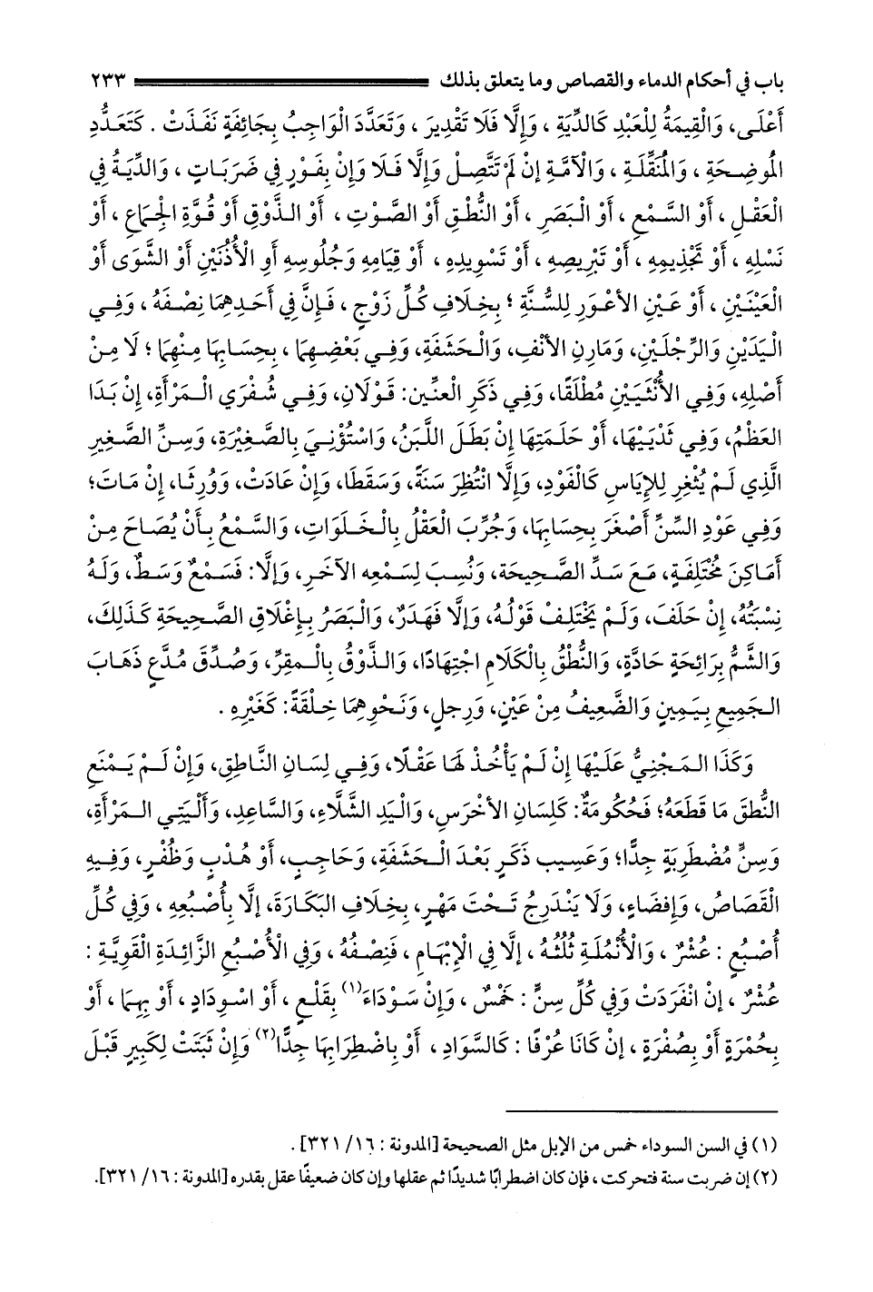 أعلى والقيمة للعبد كالدية وإلا فلا تقدير وَتَعَدُّدُ الْوَاجِبِ بِجَائِفَةٍ نَفَذَتْ كَتَعَدُّدِ الْمُوضِحَةِ وَالْمُنَقِّلَةِ وَالْآمَّةِ إنْ لَمْ تَتَّصِلْ وَإِلَّا فَلَا وَإِنْ بفور في ضربات وَالدِّيَةُ فِي الْعَقْلِ أَوْ السَّمْعِ أَوْ الْبَصَرِ أو النطق أوو الصَّوْتِ أَوْ الذَّوْقِ أَوْ قُوَّةِ الْجِمَاعِ أَوْ نَسْلِهِ أَوْ تَجْذِيمِهِ أَوْ تَبْرِيصِهِ أَوْ تَسْوِيدِهِ أو قيامه وجلوسه أَوْ الْأُذُنَيْنِ أَوْ الشَّوَى أَوْ الْعَيْنَيْنِ أَوْ عَيْنِ الْأَعْوَرِ لِلسُّنَّةِ بِخِلَافِ كُلِّ زَوْجٍ فَإِنَّ فِي أَحَدِهِمَا نِصْفَهُ وَفِي الْيَدَيْنِ وَالرِّجْلَيْنِ وَمَارِنِ الْأَنْفِ وَالْحَشَفَةِ وَفِي بَعْضِهِمَا بِحِسَابِهَا مِنْهُمَا لَا مِنْ أَصْلِهِ وَفِي الْأُنْثَيَيْنِ مُطْلَقًا وَفِي ذَكَرِ العنين: قولان وَفِي شُفْرَيْ الْمَرْأَةِ إنْ بَدَا الْعَظْمُ وَفِي ثَدْيَيْهَا أَوْ حَلَمَتَيْهِمَا إنْ بَطَلَ اللَّبَنُ وَاسْتُؤْنِيَ بالصغيرة وسن الصغير الذي لَمْ يُثْغِرْ لِلْإِيَاسِ كَالْقَوَدِ وَإِلَّا اُنْتُظِرَ سَنَةً وسقطا وإن عَادَتْ وَوَرِثَا إنْ مَاتَ وَفِي عَوْدِ السِّنِّ أصغر بحسابها وجرب العقل بالخلوات وَالسَّمْعُ بِأَنْ يُصَاحَ مِنْ أَمَاكِنَ مُخْتَلِفَةٍ مَعَ سد الصحيحة ونسب لسمعه الآخر وإلا فسمع وسط وله نسبته إن حلف ولم يختلف قوله وإلا فهدر والبصر بإغلاق الصحيحة كذلك والشم برائحة حادة والنطق بالكلام اجتهادا والذوق بالمقر وصدق مدع ذهاب الجميع بيمين وَالضَّعِيفُ مِنْ عَيْنٍ وَرِجْلٍ وَنَحْوِهِمَا خِلْقَةً: كَغَيْرِهِ.