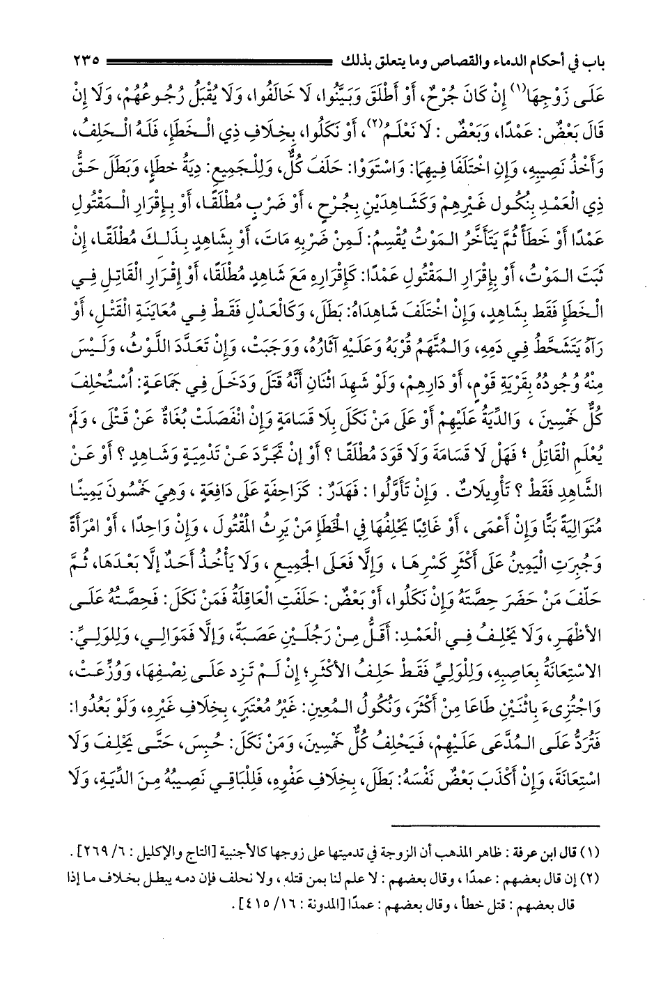 على زوجها1 إن كان جرح أو أطلق وبينوا لا خالفوا ولا يقبل رجوعهم وَلَا إنْ قَالَ بَعْضٌ: عَمْدًا وَبَعْضٌ: لَا نعلم2 أو نكلوا بِخِلَافِ ذِي الْخَطَأِ فَلَهُ الْحَلِفُ وَأَخْذُ نَصِيبِهِ وَإِنْ اخْتَلَفَا فِيهِمَا: وَاسْتَوَوْا: حَلَفَ كُلٌّ وَلِلْجَمِيعِ: دية خطإ وبطل حق ذي العمد بنكول غيرهم وكشاهدين بجرح أو ضرب مطلقا أو بإقرار المقتول عمدا أو خطأ ثُمَّ يَتَأَخَّرُ الْمَوْتُ يُقْسِمُ: لَمِنْ ضَرْبِهِ مَاتَ أو بشاهد بذلك مطلقا إن ثبت الموت أو بإقرار المقتول عمدا: كإقراره مع شاهد مطلقا أَوْ إقْرَارِ الْقَاتِلِ فِي الْخَطَأِ فَقَطْ بِشَاهِدٍ وإن اختلف شاهداه: بطل وكالعدل فقط في معاينة القتل أو رآه يَتَشَحَّطُ فِي دَمِهِ وَالْمُتَّهَمَ قُرْبُهُ وَعَلَيْهِ آثَارُهُ ووجبت وإن تعدد اللوث وَلَيْسَ مِنْهُ وُجُودُهُ بِقَرْيَةِ قَوْمٍ أَوْ دَارِهِمْ ولو شهد اثنان أَنَّهُ قَتَلَ وَدَخَلَ فِي جَمَاعَةٍ: اُسْتُحْلِفَ كُلٌّ خمسين وَالدِّيَةُ عَلَيْهِمْ أَوْ عَلَى مَنْ نَكَلَ بِلَا قسامة وَإِنْ انْفَصَلَتْ بُغَاةٌ عَنْ قَتْلَى وَلَمْ يُعْلَمْ الْقَاتِلُ فَهَلْ لَا قَسَامَةَ وَلَا قَوَدَ مُطْلَقًا؟ أَوْ إنْ تَجَرَّدَ عَنْ تَدْمِيَةٍ وَشَاهِدٍ؟ أَوْ عن الشاهد فقط؟ تأويلات وإن تأولوا: فهدر: كزاحفة على دافعة وَهِيَ خَمْسُونَ يَمِينًا مُتَوَالِيَةً بَتًّا وَإِنْ أَعْمَى أو غائبا يحلفها في الخطإ من يرث المقتول وإن واحدا أو امرأة وَجُبِرَتْ الْيَمِينُ عَلَى أَكْثَرِ كَسْرِهَا وَإِلَّا فَعَلَى الجميع وَلَا يَأْخُذُ أَحَدٌ إلَّا بَعْدَهَا ثُمَّ حَلَفَ من حضر حصته وَإِنْ نَكَلُوا أَوْ بَعْضٌ حَلَفَتْ الْعَاقِلَةُ فَمَنْ نكل فحصته على الأظهر وَلَا يَحْلِفُ فِي الْعَمْدِ أَقَلُّ مِنْ رَجُلَيْنِ عصبة وإلا فموالي وللولي الاستعانة بعاصبه وللولي فقط حلف الأكثر إن لم تزد على نصفها ووزعت واجتزىء باثنين طاعا من أكثر وَنُكُولُ الْمُعَيَّنِ: غَيْرُ مُعْتَبَرٍ بِخِلَافِ غَيْرِهِ وَلَوْ بعدوا: فَتُرَدُّ عَلَى الْمُدَّعَى عَلَيْهِمْ فَيَحْلِفُ كُلٌّ خَمْسِينَ ومن نكل: حبس حتى يحلف ولا استعانة وَإِنْ أَكْذَبَ بَعْضٌ نَفْسَهُ: بَطَلَ بِخِلَافِ عَفْوِهِ فللباقي نصيبه من الدية ولا