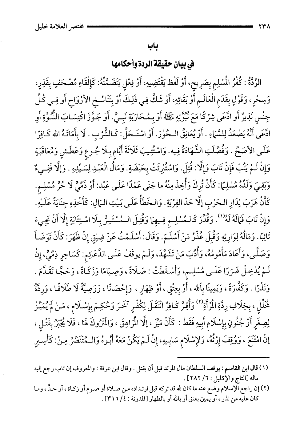 الردة: كفر المسلم بِصَرِيحٍ أَوْ لَفْظٍ يَقْتَضِيهِ أَوْ فِعْلٍ يَتَضَمَّنُهُ: كإلقاء مصحف بقذر وشد زنار وسحر وقول بقدم العالم أو بقائه أو شك في ذلك أو بتناسخ الأرواح أو في كل جنس نذير أو ادعى شركا مع نبوته صلى الله عليه وسلم أَوْ بِمُحَارَبَةِ نَبِيٍّ أَوْ جَوَّزَ اكْتِسَابَ النُّبُوَّةِ أَوْ ادَّعَى أَنَّهُ يَصْعَدُ لِلسَّمَاءِ أَوْ يُعَانِقُ الحور أو استحل: كالشرب لا بأماته الله كافرا على الأصح وفصلت الشهادة فيه وَاسْتُتِيبَ ثَلَاثَةَ أَيَّامٍ بِلَا جُوعٍ وَعَطَشٍ وَمُعَاقَبَةٍ وَإِنْ لَمْ يَتُبْ فَإِنْ تَابَ وَإِلَّا: قُتِلَ واستبرئت بحيضة ومال العبد لسيده وإلا ففيء وبقي ولده مسلما: كأن ترك وَأَخَذَ مِنْهُ مَا جَنَى عَمْدًا عَلَى عَبْدٍ: أَوْ ذِمِّيٍّ لَا حُرٍّ مُسْلِمٍ كَأَنْ هَرَبَ لدار الحرب إلا حد الفرية وَالْخَطَأُ عَلَى بَيْتِ الْمَالِ: كَأَخْذِهِ جِنَايَةً عَلَيْهِ وإن تاب فماله له1 وقدر كالمسلم فيهما وَقَتْلُ الْمُسْتَسِرِّ بِلَا اسْتِتَابَةٍ إلَّا أَنْ يَجِيءَ تائبا وماله لوارثه وَقُبِلَ عُذْرُ مَنْ أَسْلَمَ وَقَالَ: أَسْلَمْتُ عَنْ ضيق إن ظهر: كأن توضأوصلى وأعاد مأمومه وَأُدِّبَ مَنْ تَشَهَّدَ وَلَمْ يُوقَفْ عَلَى الدَّعَائِمِ: كَسَاحِرٍ ذِمِّيٍّ إنْ لَمْ يُدْخِلْ ضَرَرًا عَلَى مسلم وأسقطت: صلاة وصياما وزكاة وحجا تقدم وَنَذْرًا وَكَفَّارَةً وَيَمِينًا بِاَللَّهِ أَوْ بِعِتْقٍ أَوْ ظهار وإحصانا ووصية لَا طَلَاقًا وَرِدَّةُ مُحَلِّلٍ بِخِلَافِ رِدَّةِ الْمَرْأَةِ2 وأقر كافر انتقل لكفر آخر وَحُكِمَ بِإِسْلَامِ مَنْ لَمْ يُمَيِّزْ لِصِغَرٍ أَوْ جنون بإسلام أبيه فقط: كأن ميز إلَّا الْمُرَاهِقَ وَالْمَتْرُوكَ لَهَا فَلَا يُجْبَرُ بِقَتْلٍ إن امتنع ووقف إرثه ولإسلام سابيه إن لم يكن معه أبوه والمتنصر من: كأسير