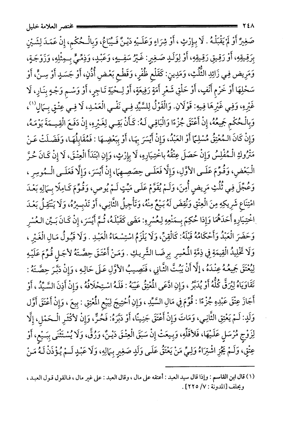 صغير أو لم يقبله لَا بِإِرْثٍ أَوْ شِرَاءٍ وَعَلَيْهِ دَيْنٌ فَيُبَاعُ وَبِالْحُكْمِ إنْ عَمَدَ لِشَيْنٍ بِرَقِيقِهِ أَوْ رَقِيقِ رقيقه أو لولد صغير: غَيْرُ سَفِيهٍ وَعَبْدٍ وَذِمِّيٍّ بِمِثْلِهِ وَزَوْجَةٍ وَمَرِيضٍ في زائد الثلث ومدين: كَقَلْعِ ظُفْرٍ وَقَطْعِ بَعْضِ أُذُنٍ أَوْ جَسَدٍ أو سن أو سَحْلِهَا أَوْ خَرْمِ أَنْفٍ أَوْ حَلْقِ شَعْرِ أَمَةٍ رَفِيعَةٍ أَوْ لِحْيَةِ تَاجِرٍ أَوْ وَسْمِ وَجْهٍ بِنَارٍ لَا غَيْرُهُ وَفِي غَيْرِهَا فِيهِ: قولان والقول للسيد في نفي العمد لا في عتق بمال1 وَبِالْحُكْمِ جَمِيعُهُ إنْ أَعْتَقَ جُزْءًا وَالْبَاقِي لَهُ: كَانَ بَقِيَ لِغَيْرِهِ إنْ دَفَعَ الْقِيمَةَ يَوْمَهُ وَإِنْ كَانَ الْمُعْتَقُ مُسْلِمًا أَوْ الْعَبْدُ وَإِنْ أَيْسَرَ بِهَا أَوْ بِبَعْضِهَا: فَمُقَابِلُهَا وَفَضَلَتْ عَنْ مَتْرُوكِ الْمُفْلِسِ وَإِنْ حَصَلَ عِتْقُهُ بِاخْتِيَارِهِ لَا بِإِرْثٍ وَإِنْ ابْتَدَأَ الْعِتْقَ لَا إنْ كَانَ حر البعض وَقُوِّمَ عَلَى الْأَوَّلِ وَإِلَّا فَعَلَى حِصَصِهِمَا إنْ أيسر وإلا فعلى الموسر وعجل في ثلث مريض أمن ولم يقوم على ميت لم يوص وَقُوِّمَ كَامِلًا بِمَالِهِ بَعْدَ امْتِنَاعِ شَرِيكِهِ مِنْ الْعِتْقِ وَنَقْضٍ لَهُ بِيعَ مِنْهُ وَتَأْجِيلُ الثَّانِي أَوْ تَدْبِيرُهُ وَلَا يَنْتَقِلُ بَعْدَ اخْتِيَارِهِ أَحَدَهُمَا وإذا حكم بمنعه لعسره: مضى كقبله ثم أيسر إن كان بين العسر وحضر العبد وأحكامه قبله: كالقن ولا يلزم استسعاء العبد ولا قبول مال الغير وَلَا تَخْلِيدُ الْقِيمَةِ فِي ذِمَّةِ الْمُعْسِرِ بِرِضَا الشريك ومن أعتق حصته لأجل قُوِّمَ عَلَيْهِ لِيُعْتِقَ جَمِيعَهُ عِنْدَهُ إلَّا أَنْ يبت الثاني فنصيب الأول على حاله وَإِنْ دَبَّرَ حِصَّتَهُ: تَقَاوَيَاهُ لِيُرَقَّ كُلُّهُ أَوْ يدبر وإن ادعى المعتق عيبه: فله استحلافه وَإِنْ أَذِنَ السَّيِّدُ أَوْ أَجَازَ عِتْقَ عَبْدِهِ جُزْءًا: قُوِّمَ فِي مَالِ السَّيِّدِ وَإِنْ اُحْتِيجَ لبيع المعتق: بيع وَإِنْ أَعْتَقَ أَوَّلَ وَلَدٍ: لَمْ يُعْتِقْ الثَّانِيَ ومات وَإِنْ أَعْتَقَ جَنِينًا أَوْ دَبَّرَهُ: فَحُرٌّ وَإِنْ لأكثر الحمل إلا لزوج مرسل عليها فلأقله وبيعت إن سبق العتق دين ورق ولا يستثنى ببيع أو عتق ولم يجز اشتراء ولي من يعتق على ولد صغير بماله ولا عبد لم يؤذن له من