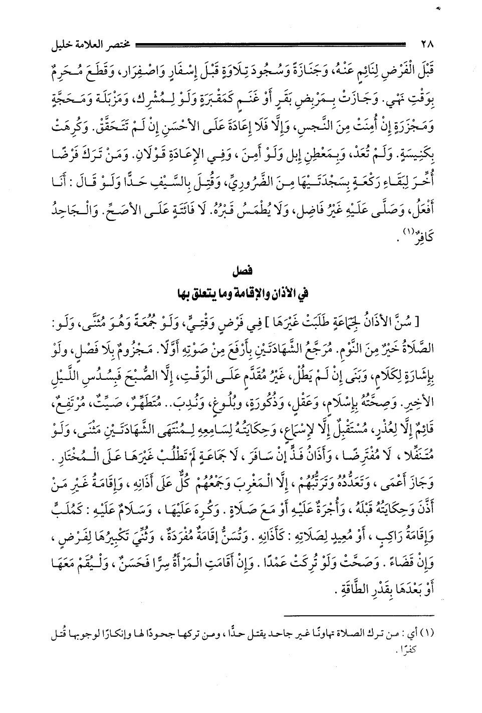 قبل الفرض لنائم عنه وجنازة وسجود تلاوة قبل إسفار واصفرار وقطع محرم بوقت نهي وجازت بمربض بقر أو غنم كمقبرة ولو لمشرك ومزبلة ومحجح ومجزرة إنْ أُمِنَتْ مِنْ النَّجَسِ وَإِلَّا فَلَا إعَادَةَ على الأحسن إن لم تتحقق وكرهت بكنيسة ولم تعد وَبِمَعْطِنِ إبِلٍ وَلَوْ أَمِنَ وَفِي الْإِعَادَةِ قَوْلَانِ وَمَنْ تَرَكَ فَرْضًا أُخِّرَ لِبَقَاءِ رَكْعَةٍ بِسَجْدَتَيْهَا مِنْ الضَّرُورِيِّ وَقُتِلَ بِالسَّيْفِ حَدًّا وَلَوْ قَالَ: أنا أفعل وَصَلَّى عَلَيْهِ غَيْرُ فَاضِلٍ وَلَا يُطْمَسُ قَبْرُهُ لا فائتة على الأصح والجاحد كافر1.