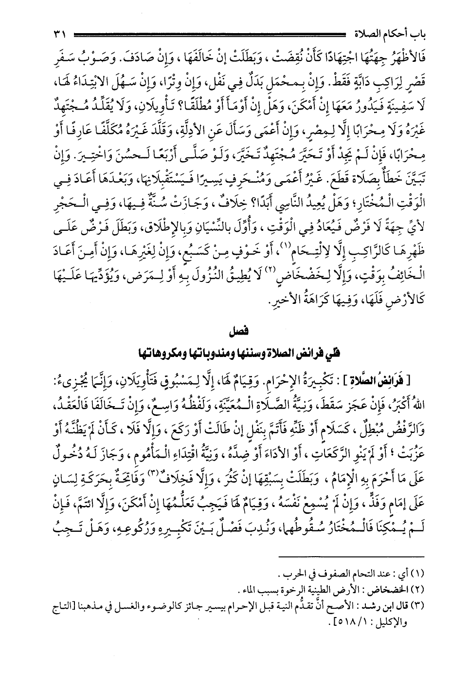 [فرائض الصلاة] : تكبيرة الإحرام وقيام لها إلا لمسبوق فتأويلان وإنما يجزىء الله أكبر فإن عجز سقط ونية الصلاة المعينة ولفظه واسع وإن تخالفا فالعقد والرفض مبطل كَسَلَامٍ أَوْ ظَنِّهِ فَأَتَمَّ بِنَفْلٍ إنْ طَالَتْ أو ركع وإلا فلا كَأَنْ لَمْ يَظُنَّهُ أَوْ عَزَبَتْ أَوْ لَمْ ينو الركعات أو الأداء أو ضده ونية اقتداء المأموم وَجَازَ لَهُ دُخُولٌ عَلَى مَا أَحْرَمَ بِهِ الإمام وبطلت بسبقها إن كثر وإلا فخلاف3 وَفَاتِحَةٌ بِحَرَكَةِ لِسَانٍ عَلَى إمَامٍ وَفَذٍّ وَإِنْ لم يسمع نفسه وقيام لها فيجب تعلمها إن أمكن وإلا أئتم فإن لم يمكنا فالمختار سقوطهما وندب فصل بين تكبيره وركوعه وهل تجب