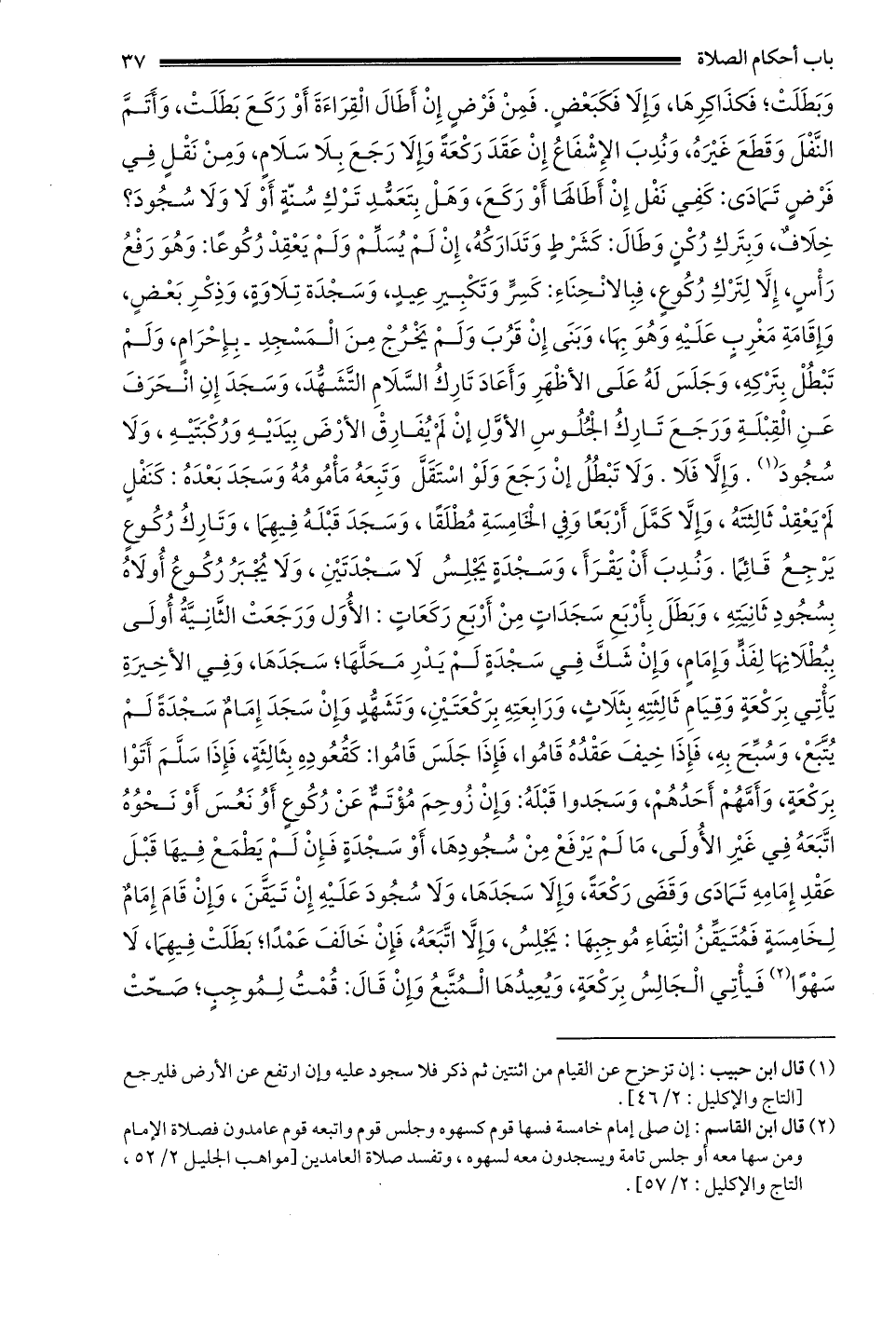 وبطلت فكذاكرها وإلا فكبعض فمن فرض أن أطال القراءة أو ركع بَطَلَتْ وَأَتَمَّ النَّفَلَ وَقَطَعَ غَيْرُهُ وَنُدِبَ الْإِشْفَاعُ إن عقد ركعة وإلا رجع بلا سلام ومن نقل فِي فَرْضٍ تَمَادَى: كَفِي نَفْلٍ إنْ أَطَالَهَا أو ركع وَهَلْ بِتَعَمُّدِ تَرْكِ سُنَّةٍ أَوْ لَا وَلَا سجود؟ خلاف وبترك ركن وطال: كشرط وَتَدَارَكَهُ إنْ لَمْ يُسَلِّمْ وَلَمْ يَعْقِدْ رُكُوعًا: وهو رفع رأس إلا لترك ركوع فَبِالِانْحِنَاءِ: كَسِرٍّ وَتَكْبِيرِ عِيدٍ وَسَجْدَةِ تِلَاوَةٍ وَذِكْرِ بعض وإقامة مغرب عليه وهو بها وَبَنَى إنْ قَرُبَ وَلَمْ يَخْرُجْ مِنْ الْمَسْجِدِ - بإحرام ولم تبطل بتركه وجلس له على الأظهر وَأَعَادَ تَارِكُ السَّلَامِ التَّشَهُّدَ وَسَجَدَ إنْ انْحَرَفَ عن القبلة وَرَجَعَ تَارِكُ الْجُلُوسِ الْأَوَّلِ إنْ لَمْ يُفَارِقْ الْأَرْضَ بِيَدَيْهِ وَرُكْبَتَيْهِ وَلَا سُجُودَ1 وَإِلَّا فَلَا ولا تبطل إن ولو استقل وتبعه مأمومه وسجد بعده: كَنَفْلٍ لَمْ يَعْقِدْ ثَالِثَتَهُ وَإِلَّا كَمَّلَ أَرْبَعًا وفي الخامسة مطلقا وسجد قبله فيهما وَتَارِكِ رُكُوعٍ يَرْجِعُ قَائِمًا وَنُدِبَ أَنْ يَقْرَأَ وسجدة يجلس لا سجدتين ولا يجبر ركوع أولاه بسجود ثانيته وَبَطَلَ بِأَرْبَعِ سَجَدَاتٍ مِنْ أَرْبَعِ رَكَعَاتٍ: الْأُوَلُ ورجعت الثانية أولى ببطلانها لفذ وإمام وَإِنْ شَكَّ فِي سَجْدَةٍ لَمْ يَدْرِ مَحَلَّهَا سَجَدَهَا وَفِي الْأَخِيرَةِ يَأْتِي بِرَكْعَةٍ وَقِيَامِ ثَالِثَتِهِ بثلاث ورابعته بركعتين وتشهد وَإِنْ سَجَدَ إمَامٌ سَجْدَةً لَمْ يُتَّبَعْ وَسَبَّحَ بِهِ فَإِذَا خِيفَ عَقْدُهُ قَامُوا فَإِذَا جَلَسَ قاموا: كقعوده بِثَالِثَةٍ فَإِذَا سَلَّمَ أَتَوْا بِرَكْعَةٍ وَأَمَّهُمْ أَحَدُهُمْ وسجدوا قبله: وَإِنْ زُوحِمَ مُؤْتَمٌّ عَنْ رُكُوعٍ أَوْ نَعَسٍ أَوْ نَحْوُهُ اتَّبَعَهُ فِي غَيْرِ الْأُولَى مَا لم يرفع من سجودها أَوْ سَجْدَةٍ فَإِنْ لَمْ يَطْمَعْ فِيهَا قَبْلَ عقد إمامه تمادى وَقَضَى رَكْعَةً وَإِلَّا سَجَدَهَا وَلَا سُجُودَ عَلَيْهِ إن تيقن وإن قام إمام لخامسة فمتيقن لانتفاء مُوجِبِهَا: يَجْلِسُ وَإِلَّا اتَّبَعَهُ فَإِنْ خَالَفَ عَمْدًا بطلت فيهما لَا سَهْوًا2 فَيَأْتِي الْجَالِسُ بِرَكْعَةٍ وَيُعِيدُهَا الْمُتَّبِعُ وإن قال: قمت لموجب صحت