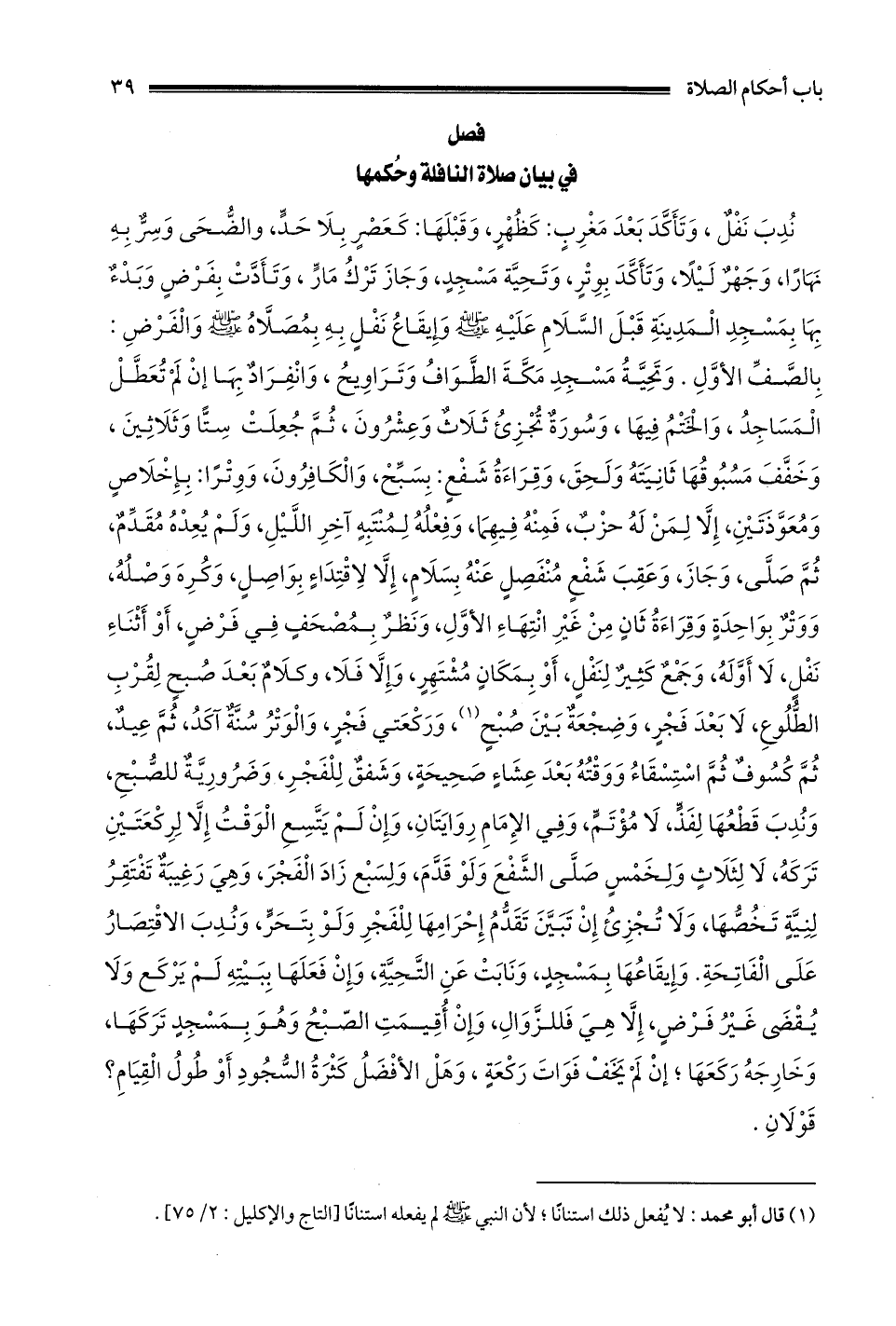 وندب نفل وتأكد بعد مغرب: كظهر وقبلها كعصر بلا حد والضحى وسر به نهارا وجهر ليلا وتأكد بوتر وتحية مسجد وجاز ترك مار وتأدت بفرض وَبَدْءٌ بِهَا بِمَسْجِدِ الْمَدِينَةِ قَبْلَ السَّلَامِ عَلَيْهِ صلى الله عليه وسلم وآله وإيقاع نفل به بمصلاه صلى الله عليه وسلم والفرض: بالصف الأول وتحية مسجد مكة والطواف وتراويح وانفراد بها إن لم تعطل المساجد والختم فيها وسورة تجزىء ثلاث وعشرون ثم جعلت ستا وثلاثين وخفف مسبوقها ثانيته ولحق وقراءة شفع بسبح والكافرون ووترا: بِإِخْلَاصٍ وَمُعَوِّذَتَيْنِ إلَّا لِمَنْ لَهُ حِزْبٌ فَمِنْهُ فيهما وَفِعْلُهُ لِمُنْتَبِهٍ آخِرَ اللَّيْلِ وَلَمْ يُعِدْهُ مُقَدَّمٌ ثم صلى وجاز وعقب شفع منفصل عنه بِسَلَامٍ إلَّا لِاقْتِدَاءٍ بِوَاصِلٍ وَكُرِهَ وَصْلُهُ وَوِتْرٌ بواحدة وقراءة ثان من غير انتهاء الأول وَنَظَرٌ بِمُصْحَفٍ فِي فَرْضٍ أَوْ أَثْنَاءَ نَفْلٍ لا أوله وَجَمْعٌ كَثِيرٌ لِنَفْلٍ أَوْ بِمَكَانٍ مُشْتَهِرٍ وَإِلَّا فلا وَكَلَامٌ بَعْدَ صُبْحٍ لِقُرْبِ الطُّلُوعِ لَا بَعْدَ فجر وضجعة بين صبح1 وركعتي فجر وَالْوِتْرُ سُنَّةٌ آكَدُ ثُمَّ عِيدٌ ثُمَّ كُسُوفٌ ثم استسقاء وَوَقْتُهُ بَعْدَ عِشَاءٍ صَحِيحَةٍ وَشَفَقٍ لِلْفَجْرِ وَضَرُورِيُّهُ للصبح وندب قطعها لفذ لا مؤتم وفي الإمام روايتان وَإِنْ لَمْ يَتَّسِعْ الْوَقْتُ إلَّا لِرَكْعَتَيْنِ تَرَكَهُ لَا لِثَلَاثٍ وَلِخَمْسٍ صَلَّى الشَّفْعَ وَلَوْ قَدَّمَ ولسبع زاد الفجر وهي رغيبة تفتقر لنية تخصها ولا تجزىء إن تبين تقدم إحرامها للفجر ولو بتحر وَنُدِبَ الِاقْتِصَارُ عَلَى الْفَاتِحَةِ وَإِيقَاعُهَا بِمَسْجِدٍ وَنَابَتْ عن التحية وإن فعلها ببيته لم يركع وَلَا يَقْضِي غَيْرَ فَرْضٍ إلَّا هِيَ فَلِلزَّوَالِ وَإِنْ أُقِيمَتْ الصُّبْحُ وَهُوَ بِمَسْجِدٍ تَرَكَهَا وَخَارِجَهُ ركعها إن لم يخف فوات ركعة وَهَلْ الْأَفْضَلُ كَثْرَةُ السُّجُودِ أَوْ طُولُ الْقِيَامِ؟ قولان.