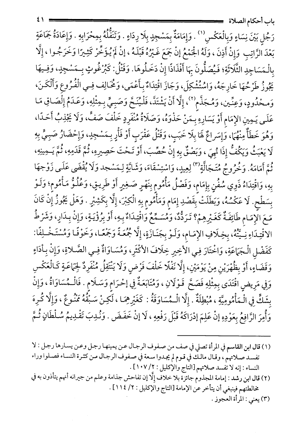 رجل بين نساء وبالعكس1 وإمامة بمسجد بلا رداء وتنفله بمحرابه وإعادة جماعة بعد الراتب وإن أذن وَلَهُ الْجَمْعُ إنْ جَمَعَ غَيْرُهُ قَبْلَهُ إنْ لم يؤخر كثيرا واخرجوا إلَّا بِالْمَسَاجِدِ الثَّلَاثَةِ فَيُصَلُّونَ بِهَا أَفْذَاذًا إنْ دخلوها وقتل: كبرغوث بمسجد وفيها يجوز طرحها خارجه واستشكل وجاز اقتداء بأعمى ومخالف في الفروع وألكن ومحدود وعنين ومجذم2 إلا أن يشتد فلينح وصبي بمثله وعدم إلصاق ما عَلَى يَمِينِ الْإِمَامِ أَوْ يَسَارِهِ بِمَنْ حَذْوَهُ وصلاة منفرد خنف صَفٍّ وَلَا يَجْذِبُ أَحَدًا وَهُوَ خَطَأٌ مِنْهُمَا وإسراع لها بلا خبب وقتل عقرب أو فأر بمسجد وَإِحْضَارُ صَبِيٍّ بِهِ لَا يَعْبَثُ وَيَكُفُّ إذَا نهي وَبَصْقٌ بِهِ إنْ حُصِبَ أَوْ تَحْتَ حَصِيرِهِ ثم قدمه ثم يمينه ثم أمامه وَخُرُوجُ مُتَجَالَّةٍ3 لِعِيدٍ وَاسْتِسْقَاءٍ وَشَابَّةٍ لِمَسْجِدٍ وَلَا يقضى على زوجها به واقتداء ذوي سفن بإمام وفصل مأموم بنهر صغير أو طريق وعلو مأموم ولو بسطح لا عكسه وبطلت بقصد إمام ومأموم به الكبر إلا بكشبر وَهَلْ يَجُوزُ إنْ كَانَ مَعَ الْإِمَامِ طَائِفَةٌ كغيرهم؟ تردد ومسمع واقتداء به أو برؤية وإن بدار وشرط الاقتداء نيته بخلاف الإمام ولو بجنازة إلا جمعة وجمعا وخوفا ومستخلفا: كفضل الجماعة واختار في الأخير خلاف الأكثر ومساواة في الصلاة وإن بأداء وقضاء أو بظهرين من يومين إلا نفلا خلف فرض وَلَا يَنْتَقِلُ مُنْفَرِدٌ لِجَمَاعَةٍ كَالْعَكْسِ وَفِي مَرِيضٍ اقتدى بمثله فصح قولان ومتابعة في إحرام وسلام فالمساواة وإن بشك في المأمومية مبطلة إلا المساوقة: كغيرهما لكن سيقه ممنوع وإلا كره وَأُمِرَ الرَّافِعُ بِعَوْدِهِ إنْ عَلِمَ إدْرَاكَهُ قَبْلَ رفعه لا إن خفض وندب تقديم سلطان ثم