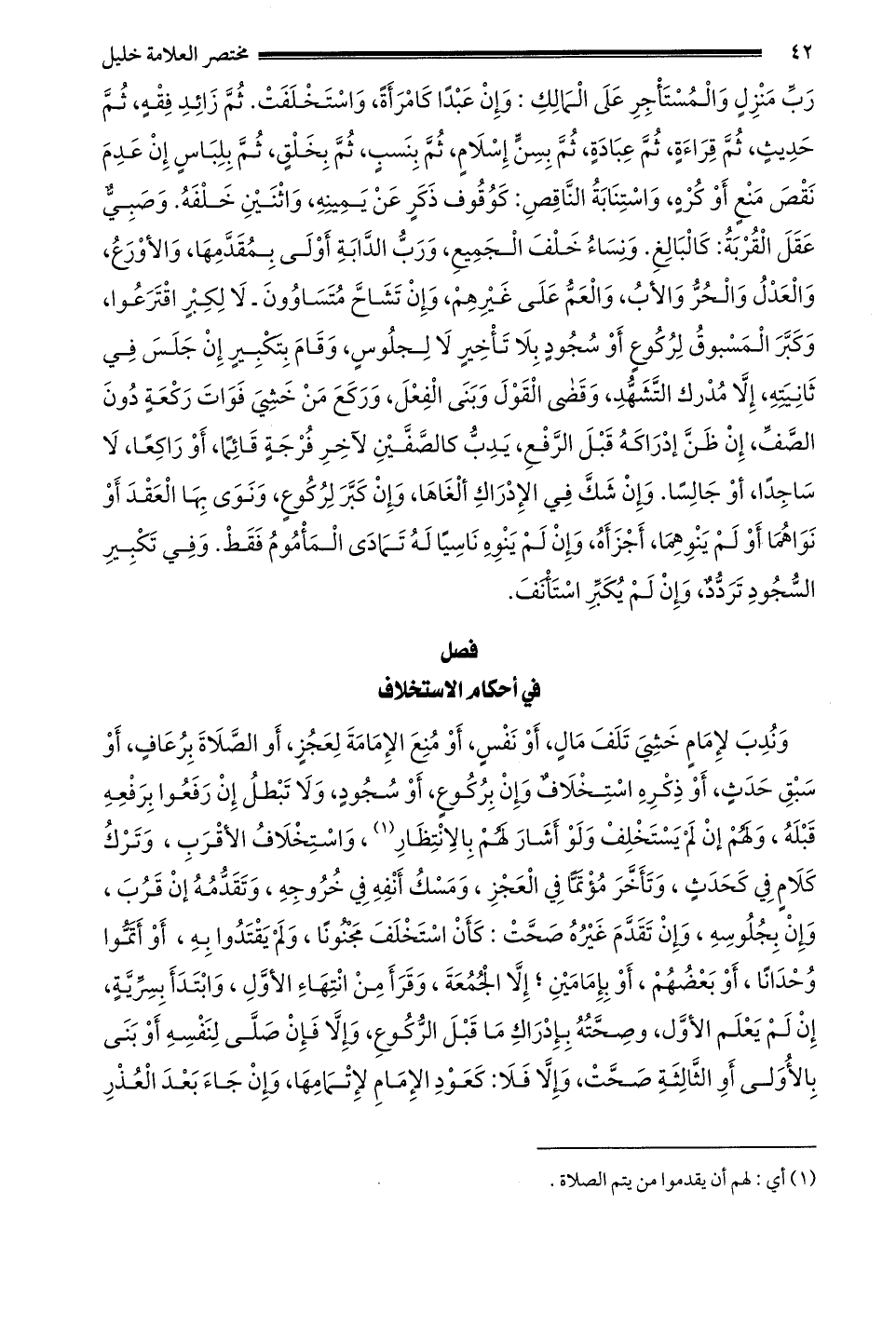 نُدِبَ لِإِمَامٍ خَشِيَ تَلَفَ مَالٍ أَوْ نَفْسٍ أو منع الإمامة لعجز أَوْ الصَّلَاةَ بِرُعَافٍ أَوْ سَبْقِ حَدَثٍ أَوْ ذكره استخلاف وإن بركوع أو سجود ولا تبطل إن رفعوا برفعه قبله ولهم إن لم يستخلف ولو أشار لهم بالانتظار1 واستخلاف الأقرب وترك كلام في كحدث وتأخر مؤتما في العجز ومسك أنفه في خروجه وتقدمه إن قرب وإن بجلوسه وإن تقدم غيره صحت: كأن استخلف مجنونا ولم يقتدوا به أَوْ أَتَمُّوا وُحْدَانًا أَوْ بَعْضُهُمْ أَوْ بِإِمَامَيْنِ إلا الجمعة وقرأ من انتهاء الأول وابتدأ بسرية إن لم يعلم الأول وصحته بإدراك ما قبل الركوع وَإِلَّا فَإِنْ صَلَّى لِنَفْسِهِ أَوْ بَنَى بِالْأَوْلَى أَوْ الثَّالِثَةِ صَحَّتْ وَإِلَّا فَلَا: كَعَوْدِ الْإِمَامِ لإتمامها وإن جاء بعد العذر