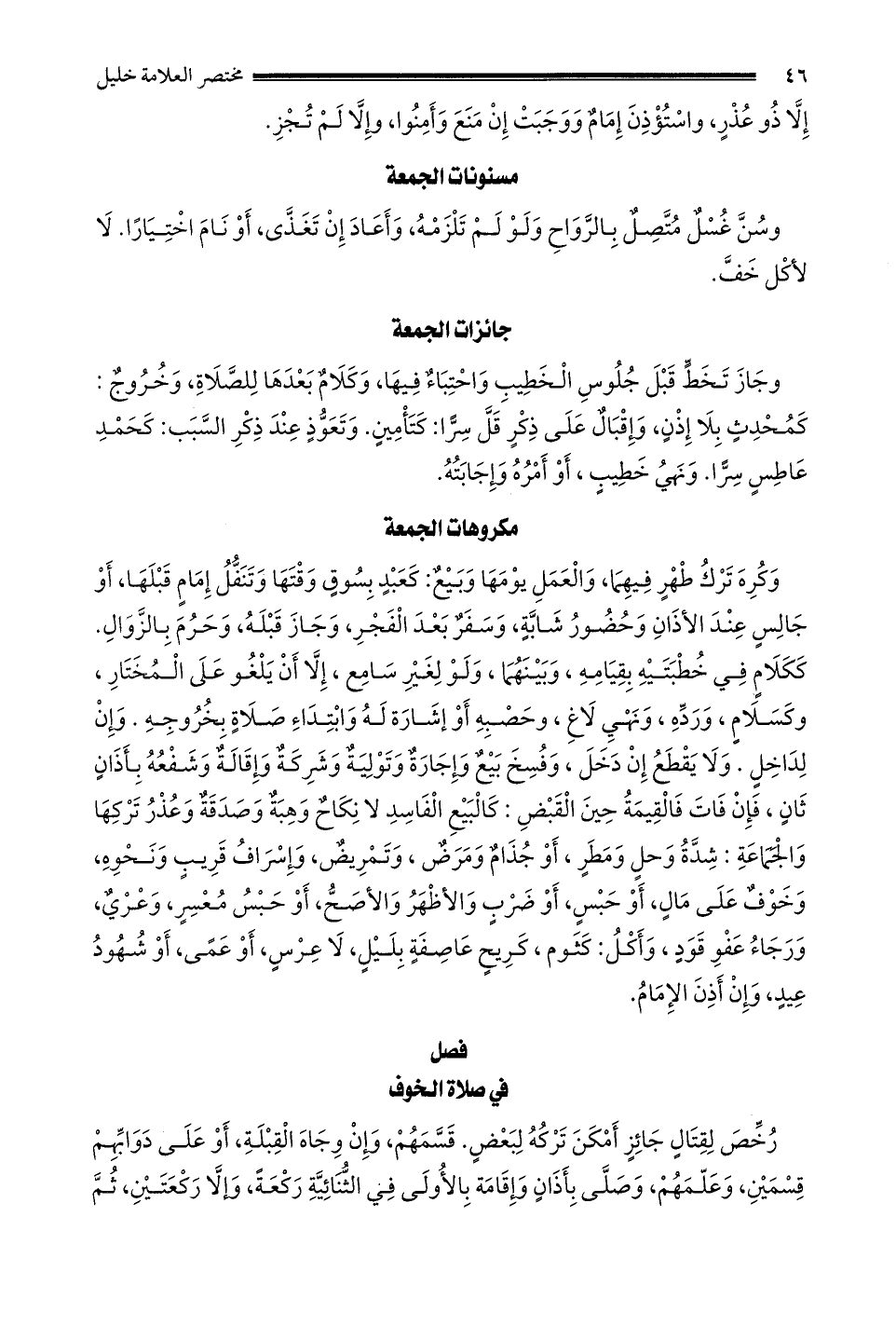 وكره ترك طهر فيهما والعمل يومها وبيع: كعبد بسوق وقتها وتنفل إمام قبلها أو جالس عند الأذان وحضور شابة وَسَفَرٌ بَعْدَ الْفَجْرِ وَجَازَ قَبْلَهُ وَحَرُمَ بِالزَّوَالِ كَكَلَامٍ فِي خُطْبَتَيْهِ بِقِيَامِهِ وَبَيْنَهُمَا وَلَوْ لِغَيْرِ سامع إلا أن يلغو على المختار وكسلام ورده ونهي لاغ وحصبه أو إشارة له وابتداء صلاة بخروجه وإن لداخل ولا يقطع إن دخل وَفُسِخَ بَيْعٌ وَإِجَارَةٌ وَتَوْلِيَةٌ وَشَرِكَةٌ وَإِقَالَةٌ وَشُفْعَةٌ بأذان ثان فإن مات فالقيمة حين القبض: كالبيع الفاسد لا نكاح وهبة وصدقة وعذر تركها والجماعة شدة وحل ومطر أو جذام ومرض وتمريض وإسراف قريب ونحوه وَخَوْفٌ عَلَى مَالٍ أَوْ حَبْسٌ أَوْ ضَرْبٌ والأظهر والأصح أو حبس معسر وعري ورجاء عفو قود وأكل: كثوم كريح عاصفة بليل لا عرس أو عمى أو شهود عيد وإن أذن الإمام.