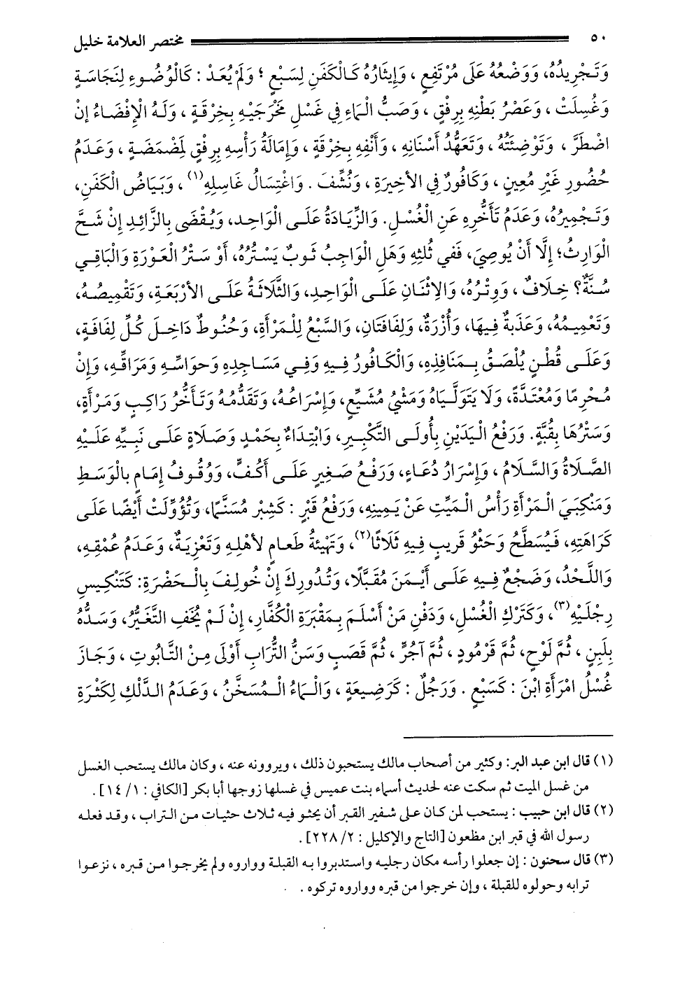 وتجريده ووضعه على مرتفع وإيثاره كَالْكَفَنِ لِسَبْعٍ وَلَمْ يُعَدْ: كَالْوُضُوءِ لِنَجَاسَةٍ وَغُسِّلَتْ وَعَصْرُ بَطْنِهِ بِرِفْقٍ وَصَبُّ الْمَاءِ فِي غَسْلِ مخرجيه بخرقة وله الإفضاء إن اضطر له وَتَوْضِئَتُهُ وَتَعَهُّدُ أَسْنَانِهِ وَأَنْفِهِ بِخِرْقَةٍ وَإِمَالَةُ رَأْسِهِ برفق لِمَضْمَضَةٍ وَعَدَمُ حُضُورِ غَيْرِ مُعِينٍ وَكَافُورٌ فِي الأخيرة ونشف واغتسال غاسله1 وَبَيَاضُ الْكَفَنِ وَتَجْمِيرُهُ وَعَدَمُ تَأَخُّرِهِ عَنْ الْغُسْلِ والزيادة على الواحد ويقضى بِالزَّائِدِ إنْ شَحَّ الْوَارِثُ إلَّا أَنْ يُوصَى فَفِي ثُلُثِهِ وَهَلْ الْوَاجِبُ ثَوْبٌ يَسْتُرُهُ أَوْ ستر العورة والباقي سنة خلاف ووتره والاثنان على الواحد والثلاثة على الأربعة وتقميصه وتعميمه وعذبة فيها وأزرة ولفافتان والسبع للمرأة وَحَنُوطٌ دَاخِلَ كُلِّ لِفَافَةٍ وَعَلَى قُطْنٍ يُلْصَقُ بِمَنَافِذِهِ وَالْكَافُورُ فِيهِ وَفِي مَسَاجِدِهِ وَحَوَاسِّهِ وَمَرَاقِّهِ وإن محرما ومعتدة ولا يتولياه ومشي مشيع وإسراعه وتقدمه وتأخر راكب ومرأة وسترها بقبة وَرَفْعُ الْيَدَيْنِ بِأُولَى التَّكْبِيرِ وَابْتِدَاءٌ بِحَمْدٍ وَصَلَاةٍ على نبيه عليه الصلاة والسلام وإسرار دعاء ورفع صغير على أكف ووقوف إمام بالوسط ومنكبي المرأة رأس الميت عن يمينه ورفع قبر: كشبر مسنما وتؤولت أيضا على كراهته فيسطح وحثو قريب فيه ثلاثا2 وتهيئة طعام لأهله وتعزية وعدم عمقه واللحد وضجع فيه على أيمن مقبلا وَتُدُورِكَ إنْ خُولِفَ بِالْحَضْرَةِ: كَتَنْكِيسِ رِجْلَيْهِ3 وَكَتَرْكِ الْغُسْلِ وَدَفْنِ مَنْ أَسْلَمَ بِمَقْبَرَةِ الْكُفَّارِ إنْ لم يخف التغير وَسَدِّهِ بِلَبِنٍ ثُمَّ لَوْحٍ ثُمَّ قَرْمُودٍ ثُمَّ آجُرٍّ ثُمَّ قَصَبٍ وَسَنُّ التُّرَابِ أَوْلَى مِنْ التابوت وجاز غسل امرأة ابن: كسبع ورجل: كرضيعة والماء المسخن وعدم الدلك لكثرة