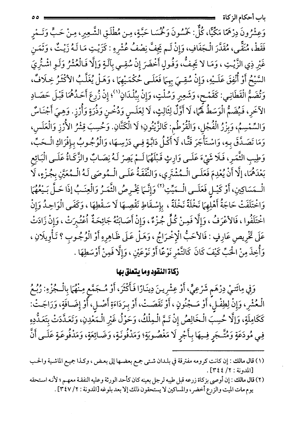 وَعِشْرُونَ دِرْهَمًا مَكِّيًّا كُلٌّ: خَمْسُونَ وَخُمُسَا حَبَّةٍ من مطلق الشعير من حب وتمر فقط منقى مقدر الجفاف وإن لم يجف نصف عشره: كزيت ما له زيت وَثَمَنِ غَيْرِ ذِي الزَّيْتِ وَمَا لَا يَجِفُّ وفول أخضر إن سقي بآلة وَإِلَّا فَالْعُشْرُ وَلَوْ اشْتَرَى السَّيْحَ أَوْ أَنْفَقَ عليه وإن سقي بهما فعلى حكميهما وهل يغلب الأكثر خلاف وتضم القطاني: كقمح وشعير وسلت وَإِنْ بِبُلْدَانٍ1 إنْ زُرِعَ أَحَدُهُمَا قَبْلَ حَصَادِ الآخر فيضم الوسط لهما لا أول لثالث لَا لِعَلَسٍ وَدُخْنٍ وَذُرَةٍ وَأُرْزٍ وَهِيَ أَجْنَاسٌ والسمسم وبزر الفجل والقرطم: كالزيتون لا الكتان وحسب قشر الأرز والعلس وما تصدق به د واستأجر قتا لا أكل دابة في درسها والوجوب بإفراك الحب وطيب الثمر فَلَا شَيْءَ عَلَى وَارِثٍ قَبْلَهُمَا لَمْ يَصِرْ له نصاب والزكاة على البائع بعدهما إلا أن يعدم فعلى المشتري وَالنَّفَقَةُ عَلَى الْمُوصَى لَهُ الْمُعَيَّنِ بِجُزْءٍ لَا المساكين أو كيل فعلى الميت2 وإنما يخرص الثمر والعنب إذا حل بيعهما واختلفت حاجة أهلهما نخلة نخلة بإسقاط نقصها لا سقطها وكفى الواحد وإن اختلفوا فالأعرف وإلا فمن كل جزء وإن أصابته جائحة اعتبرت وَإِنْ زَادَتْ عَلَى تَخْرِيصِ عَارِفٍ: فَالْأَحَبُّ الْإِخْرَاجُ وهل على ظاهره أو الوجوب؟ تأويلان وأخذ من الحب كيف كان كالتمر نوعا أو نوعين وإلا فمن أوسطها.