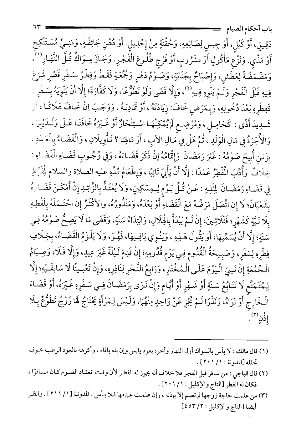 3- من علمت حاجة زوجها لم تصم إلا بإذنه وإن علمت عدمها فلا بأس. المدونة [1 / 211] . وانظر أيضا [التاج والإكليل: 2 / 354] .
