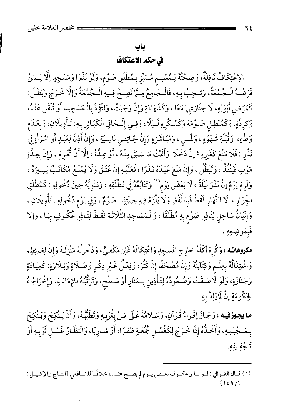 الاعتكاف نافلة وصحته لمسلم مميز بمطلق صوم ولو نذرا ومسجد إلَّا لِمَنْ فَرْضُهُ الْجُمُعَةُ وَتَجِبُ بِهِ فَالْجَامِعُ مما تصح فيه الجمعة وإلا خرج وبطل: كمرض أبويه لا جنازيهما معا وَكَشَهَادَةٍ وَإِنْ وَجَبَتْ وَلْتُؤَدَّ بِالْمَسْجِدِ أَوْ تُنْقَلْ عنه وكردة وكمبطل صومه وكسكره ليلا وفي إلحاق الكبائر به: تأويلان وبعدم وطء وقبلة شهوة ولمس ومباشرة وإن لحائض ناسية وَإِنْ أَذِنَ لِعَبْدٍ أَوْ امْرَأَةٍ فِي نَذْرٍ: فلا منع كغيره إن دخلا وأتمت ما سبق منه أو عدة إلَّا أَنْ تُحْرِمَ وَإِنْ بِعِدَّةِ مَوْتٍ فَيَنْفُذُ وتبطل وَإِنْ مَنَعَ عَبْدَهُ نَذْرًا فَعَلَيْهِ إنْ عَتَقَ ولا يمنع مكاتب يسيره ولزم يوم إن نذر ليلة لا بعض يوم1 وتتابعه في مطلقه ومنويه حين دخوله: كمطلق الجوار لا النهار فقط فباللفظ ولا يلزم فيه حينئذ: صوم وفي يوم دخوله: تأويلان وإتيان ساحل لناذر صوم به مطلقا والمساجد الثلاثة فقط لناذر عكوف بها وإلا فبموضعه.