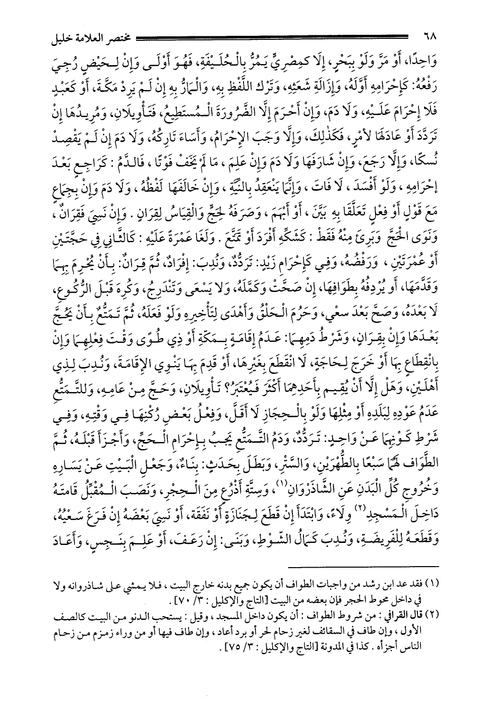 واحدا أو مر ولو ببحر إلا كمصري يمر بالحليفة فهو أولى وإن لحيض رجي رفعه: كإحرامه أوله وإزالة شعثه وترك اللفظ به وَالْمَارُّ بِهِ إنْ لَمْ يَرِدْ مَكَّةَ أَوْ كَعَبْدٍ فَلَا إحْرَامَ عَلَيْهِ وَلَا دَمَ وَإِنْ أحرم إلا الضرورة المستطيع فتأويلان ومريدها إن تردد أو عادلها لأمر فكذلك وإلا وجب الْإِحْرَامُ وَأَسَاءَ تَارِكُهُ وَلَا دَمَ إنْ لَمْ يقصد نسكا وإلا رجع وإن شارفها ولا دم وإن علم ما لم يخف فوتا فالدم: كراجع بعد إجرامه ولو أفسد لا فات وَإِنَّمَا يَنْعَقِدُ بِالنِّيَّةِ وَإِنْ خَالَفَهَا لَفْظُهُ وَلَا دم وإن بجماع مع قول أو فعل تعلقا به بَيَّنَ أَوْ أَبْهَمَ وَصَرَفَهُ لِحَجٍّ وَالْقِيَاسُ لِقِرَانٍ وإن نسي فقران ونوى الحج وبرىء منه فقط: كشكه أفرد أو تمتع وَلَغَا عُمْرَةٌ عَلَيْهِ: كَالثَّانِي فِي حَجَّتَيْنِ أَوْ عمرتين ورفضه وفي كإحرام زيد: تردد وندب: إفراد ثم قران: بأن يحرم بهما وقدمها أو يردفه بطوافها إن صحت وكمله ولا يسعى وتندرج وكره قبل الركوع لا بعده وصح بعد سعي وحرم الحلق وأهدى لتأخيره ولو فعله ثُمَّ تَمَتَّعَ بِأَنْ يَحُجَّ بَعْدَهَا وَإِنْ بِقِرَانٍ وَشَرْطُ دَمِهِمَا: عَدَمُ إقَامَةٍ بِمَكَّةَ أَوْ ذِي طوى وقت فعلهما وإن بانقطاع بها أو خرج لحاجة لا انقطع بغيرها أو قدم بها ينوي الإقامة وَنُدِبَ لِذِي أَهْلِينَ وَهَلْ إلَّا أَنْ يُقِيمَ بأحدهما أكثر فيعتبر؟ تأويلان وحج من عامه وللتمتع عدم عوده لبلده أو مثلها ولو بالحجاز لا أقل وفعل بعض ركنها في وقته وفي شرط كونهما عن واحد: تردد ودم التمتع يجب بإحرام الحج وأجزأ قبله ثم الطواف لهما سبعا بالطهرين والستر وبطل بحدث: بناء وجعل البيت عن يساره وخروج كل البدن عن الشاذروان1 وستة أذرع من الحجر ونصب المقبل قامته داخل المسجد2 ولاء وابتدأ إن قطع لجنازة أو نفقة أو نسي بعضه إن فرغ سعيه وقطعه للفريضة وندب كمال الشوط وبنى إن رعف أو علم بنجس وأعاد