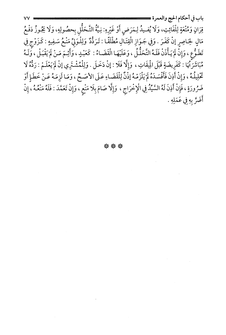 قران ومتعة للفائت وَلَا يُفِيدُ لِمَرَضٍ أَوْ غَيْرِهِ: نِيَّةُ التَّحَلُّلِ بحصوله ولا يجوز دفع مال لحاضر إن كفر وفي جواز القتال مطلقا: تردد وللولي منع سفيه كزوج في تطوع وَإِنْ لَمْ يَأْذَنْ فَلَهُ التَّحَلُّلُ وَعَلَيْهَا الْقَضَاءُ كعبد وأثم من لم يقبل وله مباشرتها: كفريضة قبل الميقات وإلا فلا: إن دخل وَلِلْمُشْتَرِي إنْ لَمْ يَعْلَمْ: رَدُّهُ لَا تَحْلِيلُهُ وإن أذن فأفسده لم يلزمه إذن للقضاء على الأصح وَمَا لَزِمَهُ عَنْ خَطَأٍ أَوْ ضَرُورَةٍ فَإِنْ أَذِنَ لَهُ السَّيِّدُ فِي الْإِخْرَاجِ وَإِلَّا صَامَ بلا منع وإن تعمد: فَلَهُ مَنْعُهُ إنْ أَضَرَّ بِهِ فِي عَمَلِهِ.
