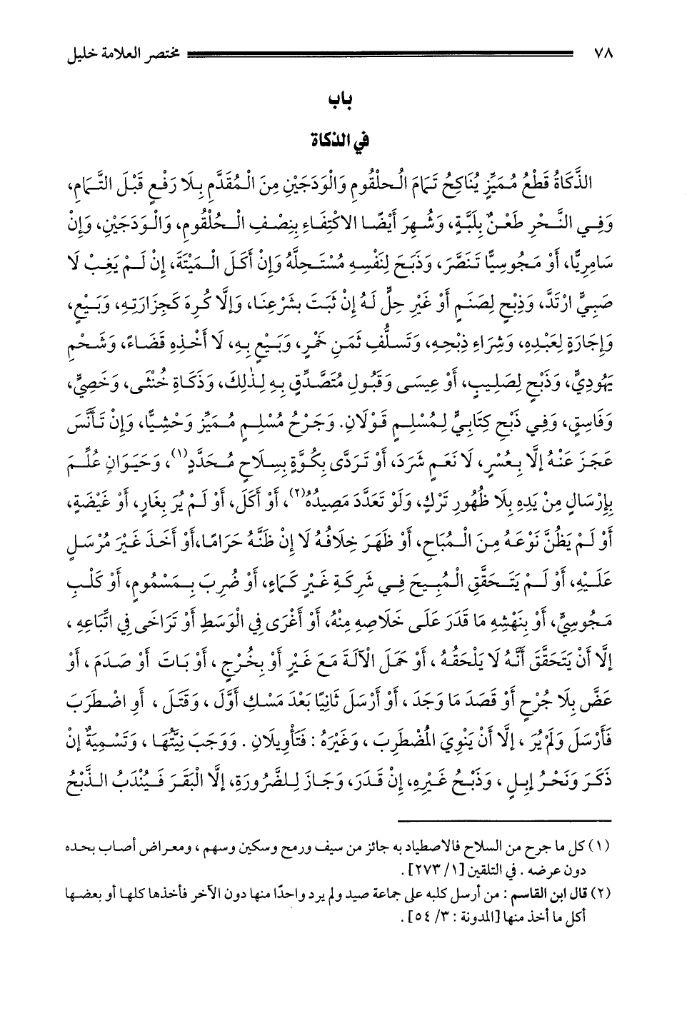 الذكاة قطع مميز يناكح تَمَامُ الْحُلْقُومِ وَالْوَدَجَيْنِ مِنْ الْمُقَدَّمِ بِلَا رَفْعٍ قبل التمام وفي النحر طعن بلبة وشهر أيضا الاكتفاء بنصف الحلقوم والودجين وإن سامريا أو مجوسيا تنصر وذبح لنفسه مستحله وإن أكل الميتة إن لم يغب لا صبي ارتد وذبح لصنم أَوْ غَيْرُ حِلٍّ لَهُ إنْ ثَبَتَ بِشَرْعِنَا وإلا كره كجزارته وبيع وإجارة لعبده وشراء ذبحه وتسلف ثمن خمر وبيع به لا أخذه قضاء وشحم يهودي وذبح لصليب أو عيسى وقبول متصدق به لذلك وذكاة خنثى وخصي وفاسق وفي ذبح كتابي لمسلم قولان وجرح مسلم مميز وحشيا وإن تأنس عجز عنه إلا بعسر لا نعم شرد أو تردى بكوة بسلاح محدد1 وحيوان علم بإرسال من يده بلا ظهور ترك ولو تعدد مصيده2 أو أكل أو لم ير بغار أو غيضة أو لم يظن نوعه من المباح أو ظهر خلافه لا إن ظنه حراما أو أخذ غير مرسل عليه أَوْ لَمْ يَتَحَقَّقْ الْمُبِيحُ فِي شَرِكَةِ غَيْرٍ كماء أو ضرب بمسموم أو كلب مجوسي أَوْ بِنَهْشِهِ مَا قَدَرَ عَلَى خَلَاصِهِ مِنْهُ أو أغرى في الوسط أَوْ تَرَاخَى فِي اتِّبَاعِهِ إلَّا أَنْ يَتَحَقَّقَ أنه لا يلحقه أَوْ حَمَلَ الْآلَةَ مَعَ غَيْرٍ أَوْ بِخُرْجٍ أو بات أو صدم أو عض بلا جرح أو قصد ما وجد أَوْ أَرْسَلَ ثَانِيًا بَعْدَ مَسْكِ أَوَّلٍ وَقَتَلَ أو اضطرب فأرسل ولم ير إلا أن ينوي المضطرب وغيره: فتأويلان ووجب نيتها وتسمية إن ذكر ونحر إبل وذبح غيره إن قدر وجاز للضرورة إلا البقر فيندب الذبح