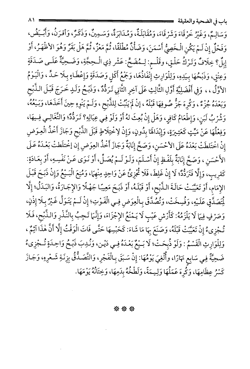 وسالم وغير خرقاء وشرقاء ومقابلة ومدابرة وَسَمِينٌ وَذَكَرٌ وَأَقْرَنُ وَأَبْيَضُ وَفَحْلٌ إنْ لَمْ يكن الخصي أسمن وَضَأْنٌ مُطْلَقًا ثُمَّ مَعْزٌ ثُمَّ هَلْ بَقَرٌ وهو الأظهر أو إبل؟ خلاف وَتَرْكُ حَلْقٍ وَقَلْمٍ: لِمُضَحٍّ: عَشَرَ ذِي الْحِجَّةِ وضحية على صدقة وعتق وذبحها بيده وللوارث إنفاذها وجمع أكل وصدقة وإعطاء بلا حد واليوم الأول أفضل وهل جميعه أو إلى الزوال قولان وَفِي أَفْضَلِيَّةِ أَوَّلِ الثَّالِثِ عَلَى آخِرِ الثَّانِي تردد وذبح ولد خرج قبل الذبح في الكراخة في الضحية والعقيقة وَكُرِهَ جَزُّ صُوفِهَا قَبْلَهُ إنْ لَمْ يَنْبُتْ للذبح ولم ينوه حين أخذها وبيعه وشرب لبن وإطعام كافر وهل إن بعث له أو ولو في عياله؟ تردد والتغالي فيها وفعلها عن ميت كعتيرة وإبدالها بدون وإن لاختلاط قبل الذبح وَجَازَ أَخْذُ الْعِوَضِ إنْ اخْتَلَطَتْ بَعْدَهُ عَلَى الأحسن وصح إنابة بلفظ إن أسلم ولو لم يصل أو نوى عن نفسه أو بعادة: كقريب وإلا فتردد لا إن غلط فلا تجزي عن واحد منهما ومنع البيع وإن ذبح قبل الإمام أو تعيبت حالة الذبح أو قبله أو ذبح معيبا جهلا والإجارة والبدل إلا لمتصدق عليه وفسخت وَتَصَدَّقَ بِالْعِوَضِ فِي الْفَوْتِ إنْ لَمْ يَتَوَلَّ غير بلا إذن وصرف فيما لا يلزمه: كأرش عيب لا يمنع الإجزاء وإنما تجب بالنذر والذبح فلا تجزىء إنْ تَعَيَّبَتْ قَبْلَهُ وَصَنَعَ بِهَا مَا شَاءَ: كَحَبْسِهَا حَتَّى فَاتَ الْوَقْتُ إلَّا أَنَّ هَذَا آثم وللوارث القسم: ولو ذبحت لا بيع بعده في دين وندب ذبح واحدة تجزىء ضحية في سابع الولادة نهارا وألغي يومها: إن سبق بالفجر والتصدق بزنة شعره وجاز كسر عظامها وكره عملها وليمة ولطخه بدمها وختانه يومها.
