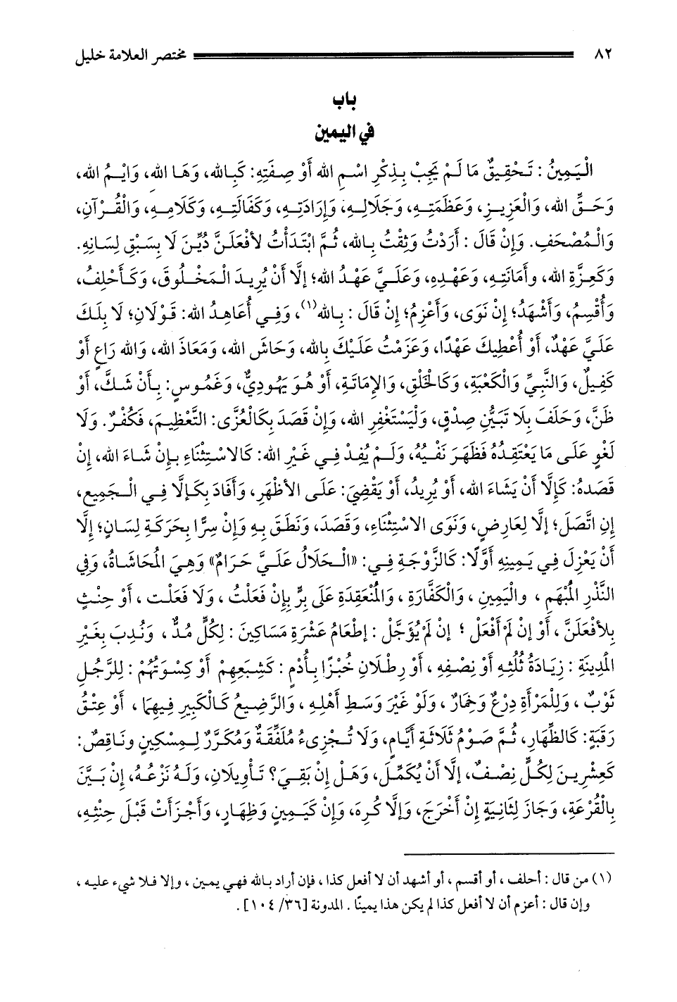 اليمين: تحقيق ما لم يجب بذكر اسم الله أو صفته: كبالله وهالله وايم الله وحق الله والعزيز وعظمته وجلاله وإرادته وكفالته وكلامه والقرآن والمصحف وَإِنْ قَالَ: أَرَدْت وَثِقْت بِاَللَّهِ ثُمَّ ابْتَدَأْت لأفعلن دين لا بسبق لسانه وَكَعِزَّةِ اللَّهِ وَأَمَانَتِهِ وَعَهْدِهِ وَعَلَى عَهْدِ اللَّهِ إلا أن يريد المخلوق وكأحلف وأقسم وأشهد إن نوى وأعزم إن قال: بالله1 وفي أعاهد الله: قولان لَا بِلَكَ عَلَيَّ عَهْدٌ أَوْ أُعْطِيك عَهْدًا وعزمت عليك بالله وحاش الله ومعاذ الله والله راع أو كفيل والنبي والكعبة وكالخلق والإماتة أو هو يهودي وَغَمُوسٌ: بِأَنْ شَكَّ أَوْ ظَنَّ وَحَلَفَ بِلَا تبين صدق وليستغفر الله وإن قصد بكالعزى: التعظيم فكفر وَلَا لَغْوٍ عَلَى مَا يَعْتَقِدُهُ فَظَهَرَ نَفْيُهُ ولم يفد في غير الله: كالاستثناء بإن شاء الله إن قصده: كَإِلَّا أَنْ يَشَاءَ اللَّهُ أَوْ يُرِيدَ أَوْ يقضي: على الأظهر وأفاد بكإلا في الجميع إنْ اتَّصَلَ إلَّا لِعَارِضٍ وَنَوَى الِاسْتِثْنَاءَ وَقَصَدَ ونطق به وإن سرا بحركة لسان إلَّا أَنْ يَعْزِلَ فِي يَمِينِهِ أَوَّلًا: كَالزَّوْجَةِ في: "الحلال علي حرام" وهي المحاشاة وفي النذر المبهم واليمين والكفارة وَالْمُنْعَقِدَةُ عَلَيَّ بَرٌّ بِأَنْ فَعَلْت وَلَا فَعَلْت أَوْ حَنِثَ بِلَأَفْعَلَنَّ أَوْ إنْ لَمْ أَفْعَلْ إن لم يؤجل: إطعام عشرة مساكين: لكل مد وَنُدِبَ بِغَيْرِ الْمَدِينَةِ: زِيَادَةُ ثُلُثِهِ أَوْ نِصْفِهِ أو رطلان خبزا بأدم: كشبعهم أو كسوتهم: للرجل ثوب وللمرأة درع وخمار ولو غير وسط أهله والرضيع كالكبير فيهما أو عتق رقبة: كالظهار ثم صوم ثلاثة أيام ولا تجزىء ملفقة وَمُكَرَّرٌ لِمِسْكِينٍ وَنَاقِصٌ: كَعِشْرِينَ لِكُلٍّ نِصْفٌ إلَّا أَنْ يَكْمُلَ وَهَلْ إنْ بَقِيَ؟ تَأْوِيلَانِ وَلَهُ نزعه إن بين بالقرعة وَجَازَ لِثَانِيَةٍ إنْ أَخْرَجَ وَإِلَّا كُرِهَ وَإِنْ كيمين وظهار وأجزأت قبل حنثه,