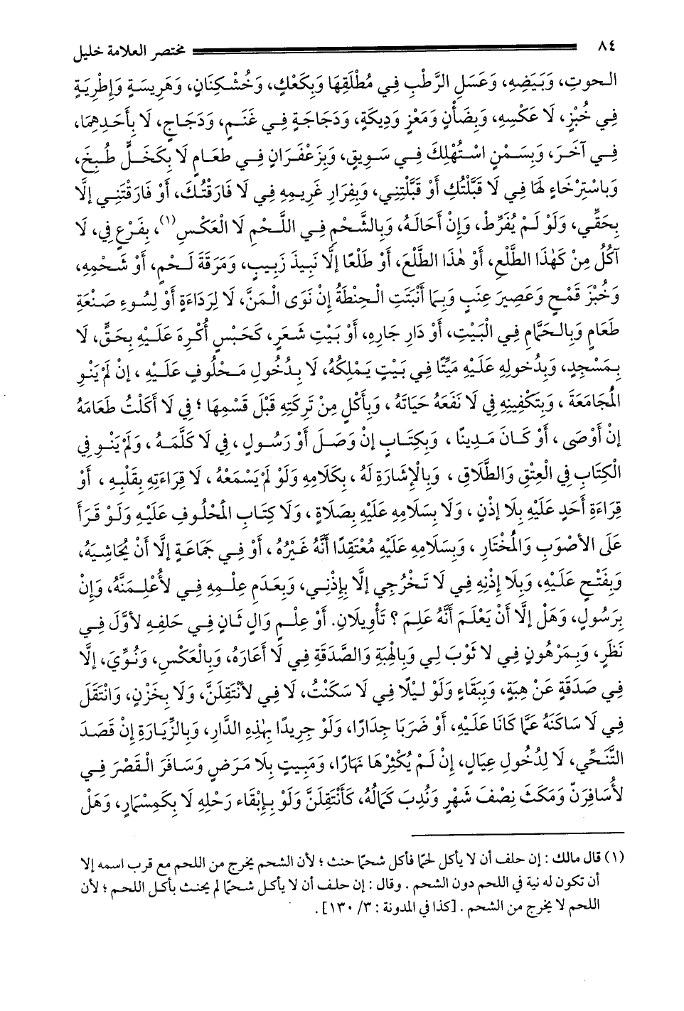 1- قال مالك: إن حلف أن لا يأكل لحما فأكل شحما حنث لأن الشحم يخرج من اللحم مع قرب اسمه إلا أن تكون له نية في اللحم دون الشحم وقال: إن حلف أن لا يأكل شحما لم يحنث بأكل اللحم لأن اللحم لا يخرج من الشحم [كذا في المدونة: 3 / 130] .