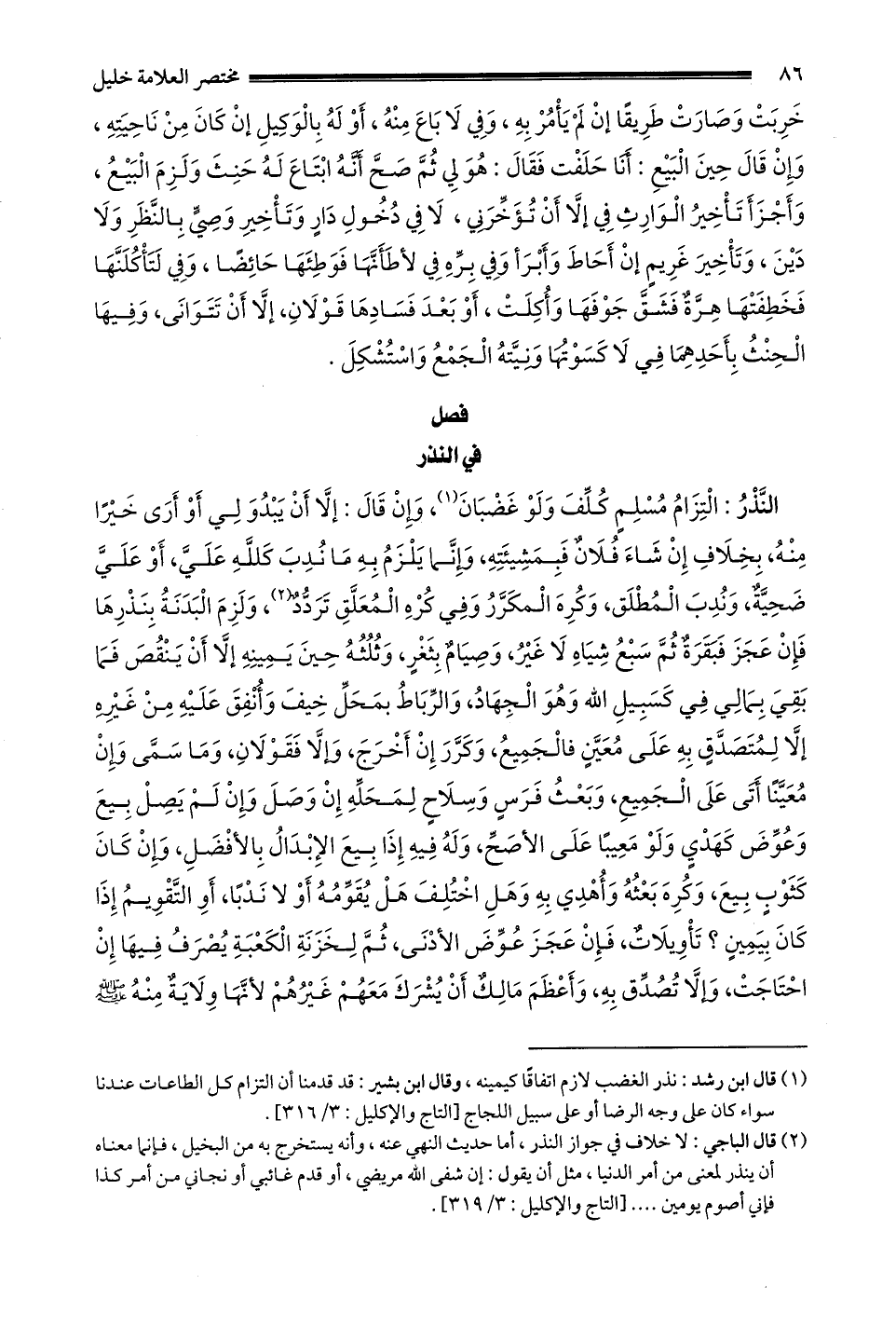 النذر: التزام مسلم كلف ولو غضبان1 وَإِنْ قَالَ: إلَّا أَنْ يَبْدُوَ لِي أَوْ أَرَى خَيْرًا مِنْهُ بِخِلَافِ إنْ شَاءَ فُلَانٌ فبمشيئته وإنما يلزم به ما ندب كلله علي أو علي ضحية وندب المطلق وكره المكرر وفي كره المعلق تردد2 وَلَزِمَ الْبَدَنَةُ بِنَذْرِهَا فَإِنْ عَجَزَ فَبَقَرَةٌ ثُمَّ سبع شياه لا غير وصيام بثغر وَثُلُثَهُ حِينَ يَمِينِهِ إلَّا أَنْ يَنْقُصَ فَمَا بَقِيَ بِمَالِي فِي كَسَبِيلِ اللَّهِ وَهُوَ الْجِهَادُ والرباط يمحل خيف وأنفق عليه من غيره إلا لمتصدق به على معين فالجميع وكرر إن أخرج وإلا فقولان وَمَا سَمَّى وَإِنْ مُعَيَّنًا أَتَى عَلَى الْجَمِيعِ وبعث فرس وسلاح لمحله إن وصل وإن لم يصل بيع وعوض كهدي ولو معيبا على الأصح وله فيه إذا بيع الإبدال بالأفضل وإن كان كثوب بيع وكره بعثه وأهدي به وهل اختلف هل يقومه أو لا ندبا أو التقويم إذا كان بيمين تأويلات فَإِنْ عَجَزَ عَوَّضَ الْأَدْنَى ثُمَّ لِخَزَنَةِ الْكَعْبَةِ يَصْرِفُ فِيهَا إنْ احْتَاجَتْ وَإِلَّا تَصَدَّقَ بِهِ وَأَعْظَمَ مَالِكٌ أَنْ يُشْرِكَ مَعَهُمْ غَيْرَهُمْ لِأَنَّهَا ولاية منه صلى الله عليه وسلم
