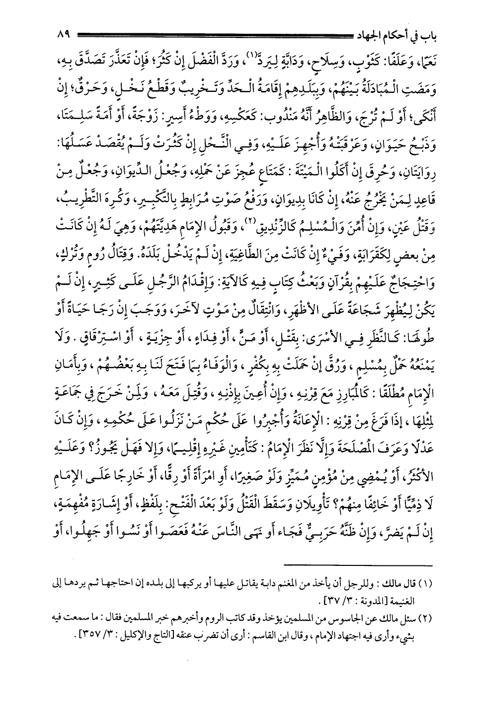 نعما وعلفا: كثوب وسلاح ودابة ليرد1 وَرَدُّ الْفَضْلِ إنْ كَثُرَ فَإِنْ تَعَذَّرَ تَصَدَّقَ به ومضت المبادلة بينهم وببلدهم إقامة الحد وَتَخْرِيبٌ وَقَطْعُ نَخْلٍ وَحَرْقٌ إنْ أَنْكَى أَوْ لم ترج والظاهر أنه مندوب: كعكسه ووطء أسير: زوجة أو أمة سلمتا وذبح حيوان وعرقبته وأجهز عليه وَفِي النَّحْلِ إنْ كَثُرَتْ وَلَمْ يُقْصَدْ عَسَلُهَا: روايتان وحرق إن أكلوا الميتة: كمتاع عجز عن حمله وجعل الديوان وَجَعَلَ مَنْ قَاعَدَ لِمَنْ يَخْرُجُ عَنْهُ إنْ كانا بديوان ورفع صوت مرابط بالتكبير وكره التطريب وقتل عين وإن أمن والمسلم كالزنديق2 وَقَبُولُ الْإِمَامِ هَدِيَّتُهُمْ وَهِيَ لَهُ إنْ كَانَتْ من بعض لكقرابة وَفَيْءٌ إنْ كَانَتْ مِنْ الطَّاغِيَةِ إنْ لَمْ يدخل بلده وقتال روم وترك وَاحْتِجَاجٌ عَلَيْهِمْ بِقُرْآنٍ وَبَعْثِ كِتَابٍ فِيهِ كَالْآيَةِ: وَإِقْدَامُ الرَّجُلِ عَلَى كَثِيرٍ إنْ لَمْ يَكُنْ ليظهر شجاعة على الأظهر وانتقال من موت لآخر ووجب إن رجا حياة أو طولها: كَالنَّظَرِ فِي الْأَسْرَى: بِقَتْلٍ أَوْ مَنٍّ أَوْ فداء أو جزية أو استرقاق ولا يمنعه حمل بمسلم ورق إن حملت به بكفر والوفاء بما فتح لنا به بعضهم وبأمان الإمام مطلقا: كالمبارز مع قرنه وإن أعين بإذنه قتل معه وَلِمَنْ خَرَجَ فِي جَمَاعَةٍ لِمِثْلِهَا إذَا فَرَغَ من قرنه: الإعانة وَأُجْبِرُوا عَلَى حُكْمِ مَنْ نَزَلُوا عَلَى حُكْمِهِ إنْ كَانَ عَدْلًا وَعَرَفَ الْمَصْلَحَةَ وَإِلَّا نَظَرَ الإمام: كتأمين غيره إقليما وَإِلَّا فَهَلْ يَجُوزُ؟ وَعَلَيْهِ الْأَكْثَرُ أَوْ يَمْضِي من مؤمن مميز ولو صغيرا أو امرأة أو رقا أو خارجا على الإمام لا ذميا أو خائفا منهم؟ تأويلان وسقط القتل ولو بعد الفتح: بلفظ أو إشارة مفهمة إن لم يضر وإن ظنه حربي فَجَاءَ أَوْ نَهَى النَّاسَ عَنْهُ فَعَصَوْا أَوْ نسوا أو جهلوا أو