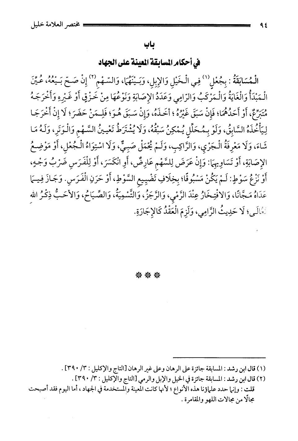 1- قال ابن رشد: المسابقة جائزة على الرهان وعلى غير الرهان [التاج والإكليل: 3 / 390] .