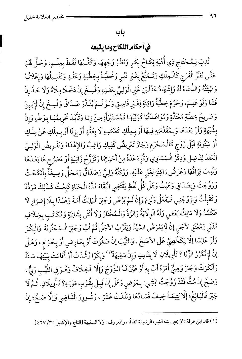 ندب لمحتاج ذي أهبة نكاح بكر ونظر وجهها وكفيها فقط بعلم وحل لهما حتى نظر الفرج كالملك وتمتع بغير دبر وخطبة بخطبة وعقد وتقليلها وإعلانه وتهنئته والدعاء له وإشهاد عدلين غير الولي بعقده وفسخ إن دخلا بلا هو ولا حد إن فشا ولو علم وَحَرُمَ خِطْبَةُ رَاكِنَةٍ لِغَيْرِ فَاسِقٍ وَلَوْ لَمْ يقدر صداق وفسخ إن لم يبن وصريح خطبة معتدة ومواعدتها كوليها كمستبرأة من زنا وتأبد تحريمها بوطء وإن بشبهة ولو بعدها وبمقدمته فيها أو بملك كعكسه لا بعقد أو بزنا أو بملك عن ملك أو مبتوتة قبل زوج كالمحرم وجاز تعريض كفيك راغب والإهداء وتفويض الولي العقد لفاضل وذكر المساوي وكره عدة من أحدهما وتزوج زانية أو مصرح لها بعدها وندب فراقها وعرض راكنة لغير عليه وركنه ولي وصداق ومحل وصيغة بأنكحت وزوجت وبصداق وهبت وَهَلْ كُلُّ لَفْظٍ يَقْتَضِي الْبَقَاءَ مُدَّةَ الْحَيَاةِ كبعت كذلك تردد وكقبلت وبزوجني فيفعل ولزم وإن لم يرض وجبر المالك أمة وعبدا بلا إضرار لا عكسه ولا مالك بعض وله الولاية والرد وَالْمُخْتَارُ وَلَا أُنْثَى بِشَائِبَةٍ وَمُكَاتَبٍ بِخِلَافِ مُدَبَّرٍ وَمُعْتَقٍ لِأَجَلٍ إنْ لَمْ يَمْرَضْ السَّيِّدُ وَيَقْرُبْ الأجل ثم أب وجبر المجنونة والبكر ولو عانسا إلا لكخصي على الأصح والثيب إن صغرت أو بعارض أو بحرام وهل إن لم تكرر الزنا؟ تأويلان لا بفاسد وإن سفيهة1 وبكرا رشدت أو أقامت ببينتها سنة وأنكرت وَجَبْرُ وَصِيٍّ أَمَرَهُ أَبٌ بِهِ أَوْ عَيَّنَ له الزوج وإلا فخلاف وهو في الثيب ولي وَصَحَّ إنْ مِتّ فَقَدْ زَوَّجْت ابْنَتِي: بِمَرَضٍ وَهَلْ إنْ قَبِلَ بِقُرْبِ مَوْتِهِ؟ تَأْوِيلَانِ ثُمَّ لا جبر فالبالغ إلَّا يَتِيمَةً خِيفَ فَسَادُهَا وَبَلَغَتْ عَشْرًا وَشُووِرَ القاضي وإلا صح إن