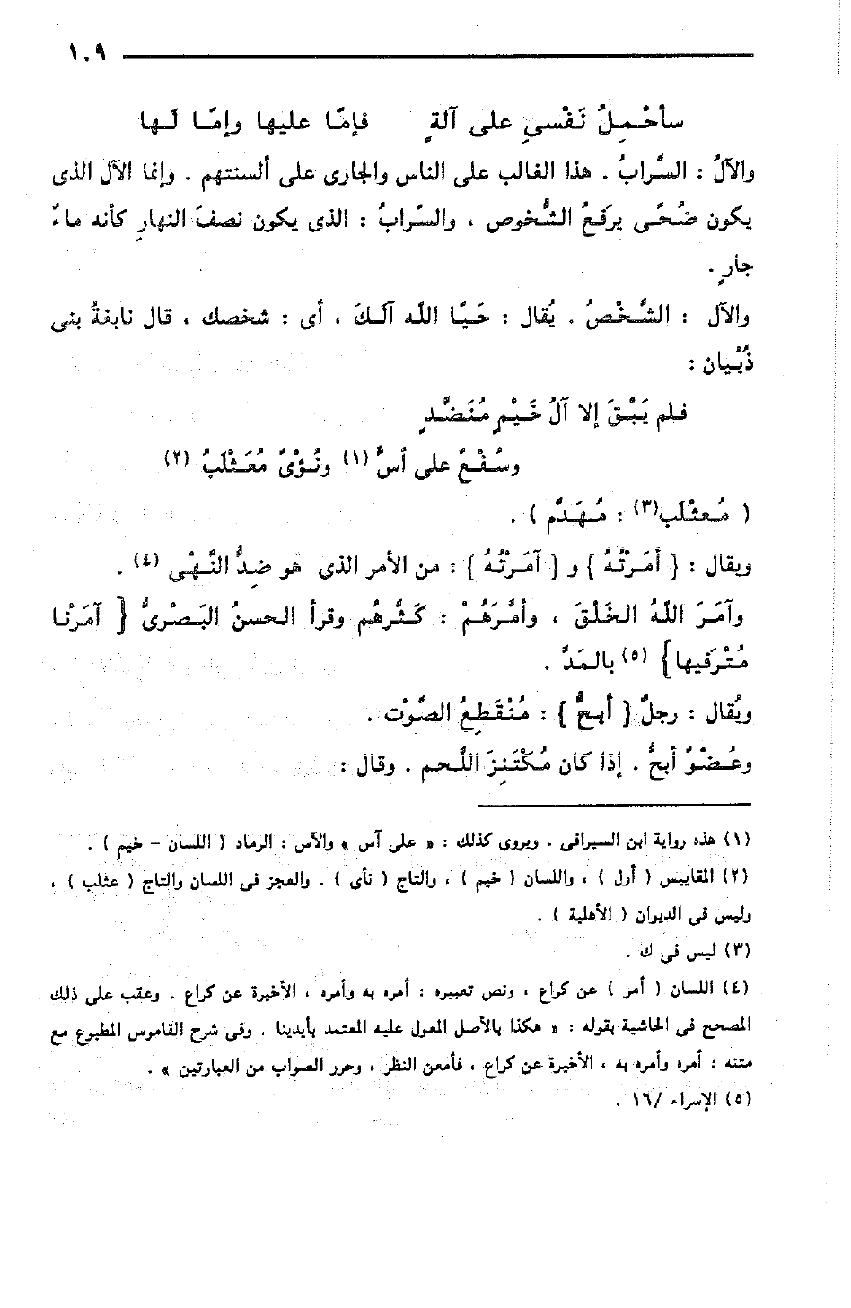 والآل: السَّرابُ، وهذا الغالب على الناس والجاري على ألسنتهم، وإنما الآل: الذي يكون ضُحىً يرفعُ الشُّخوص، والسَّرابُ: الذي يكون نِصْفَ النهار كأنه ماءٌ جارٍ.